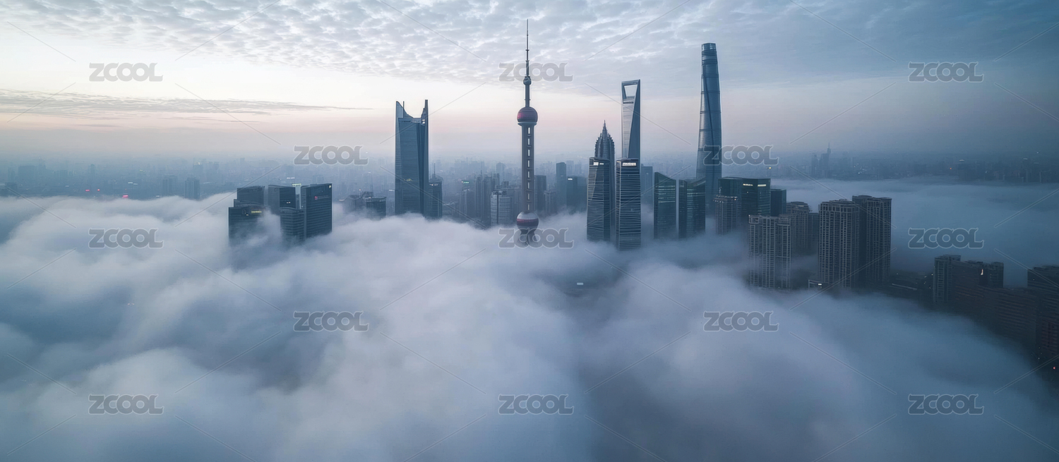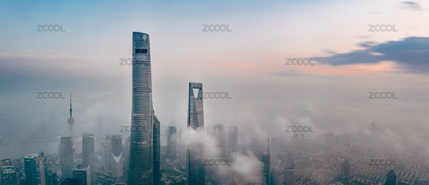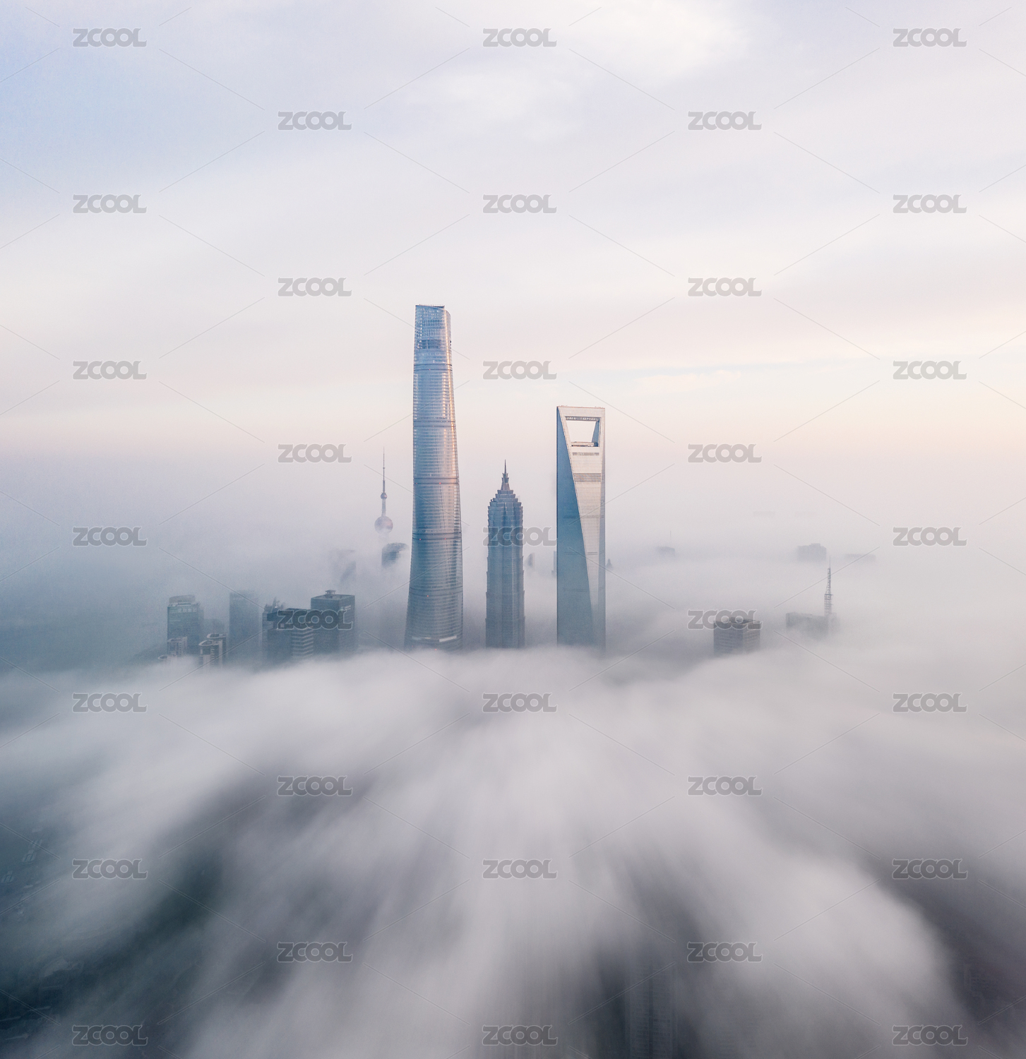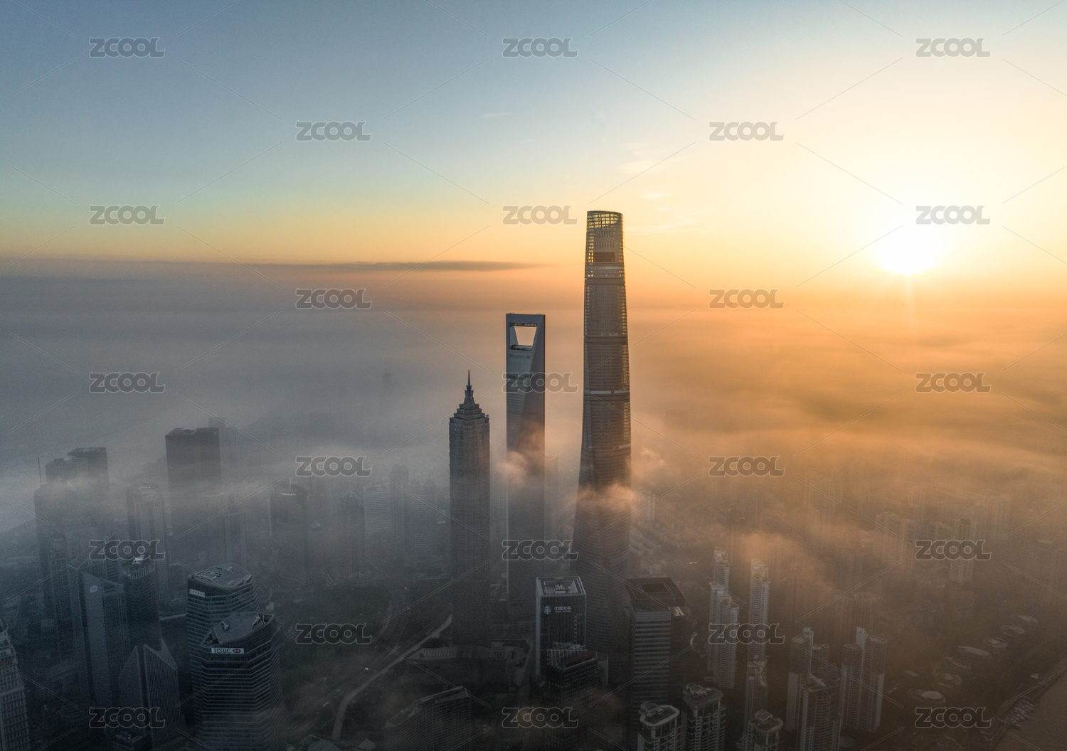 中国上海浦东陆家嘴地标建筑群平流雾航拍