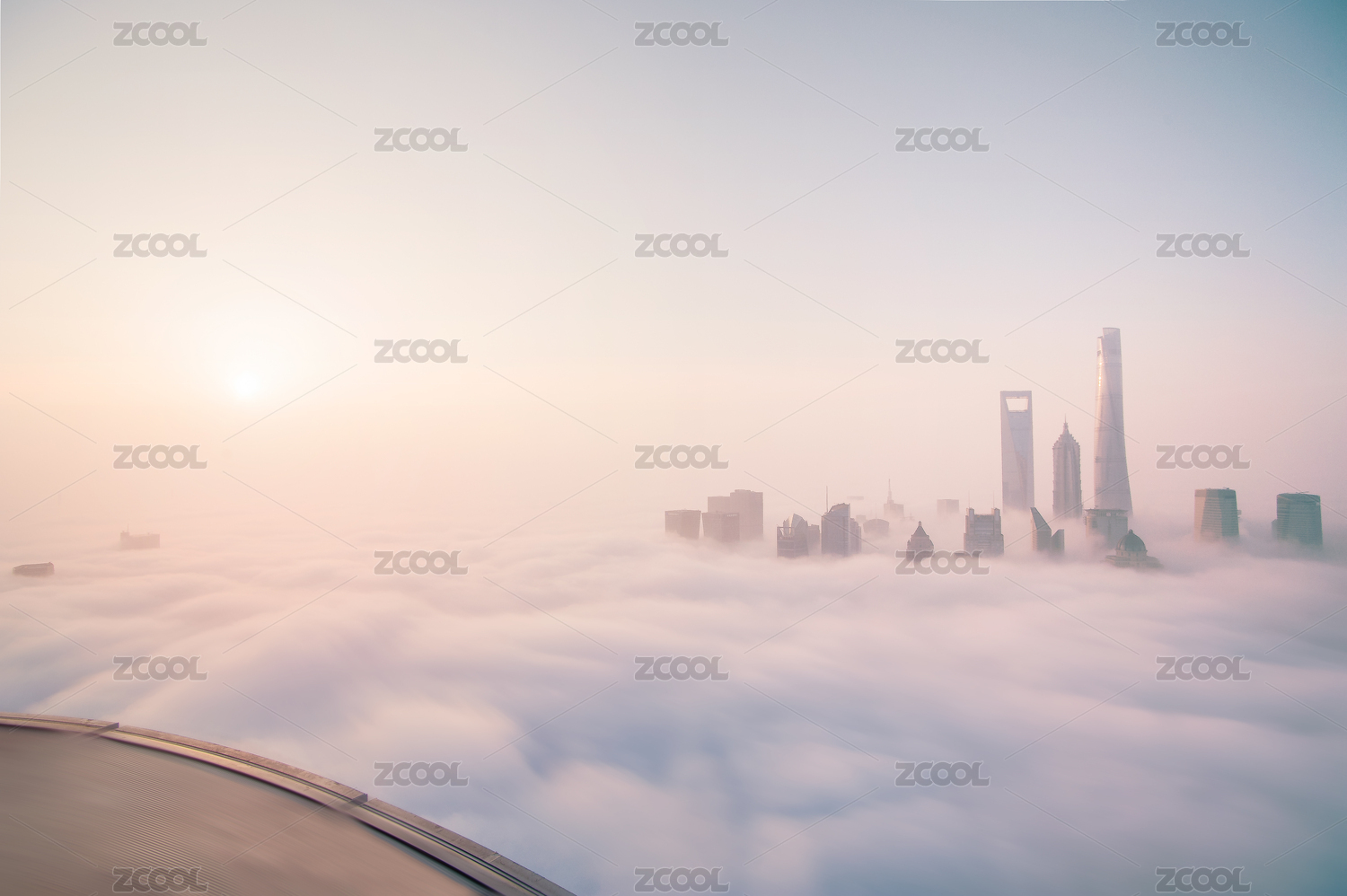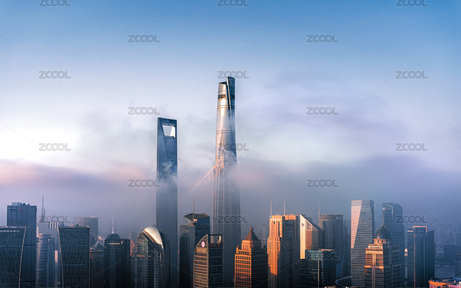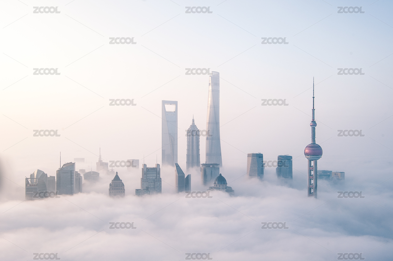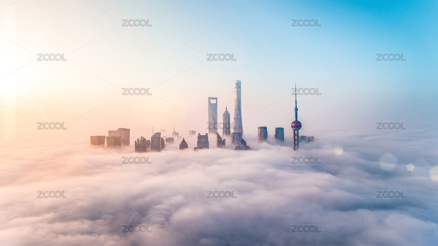 中国上海浦东陆家嘴地标建筑群平流雾航拍