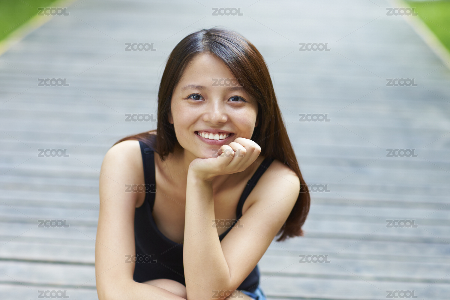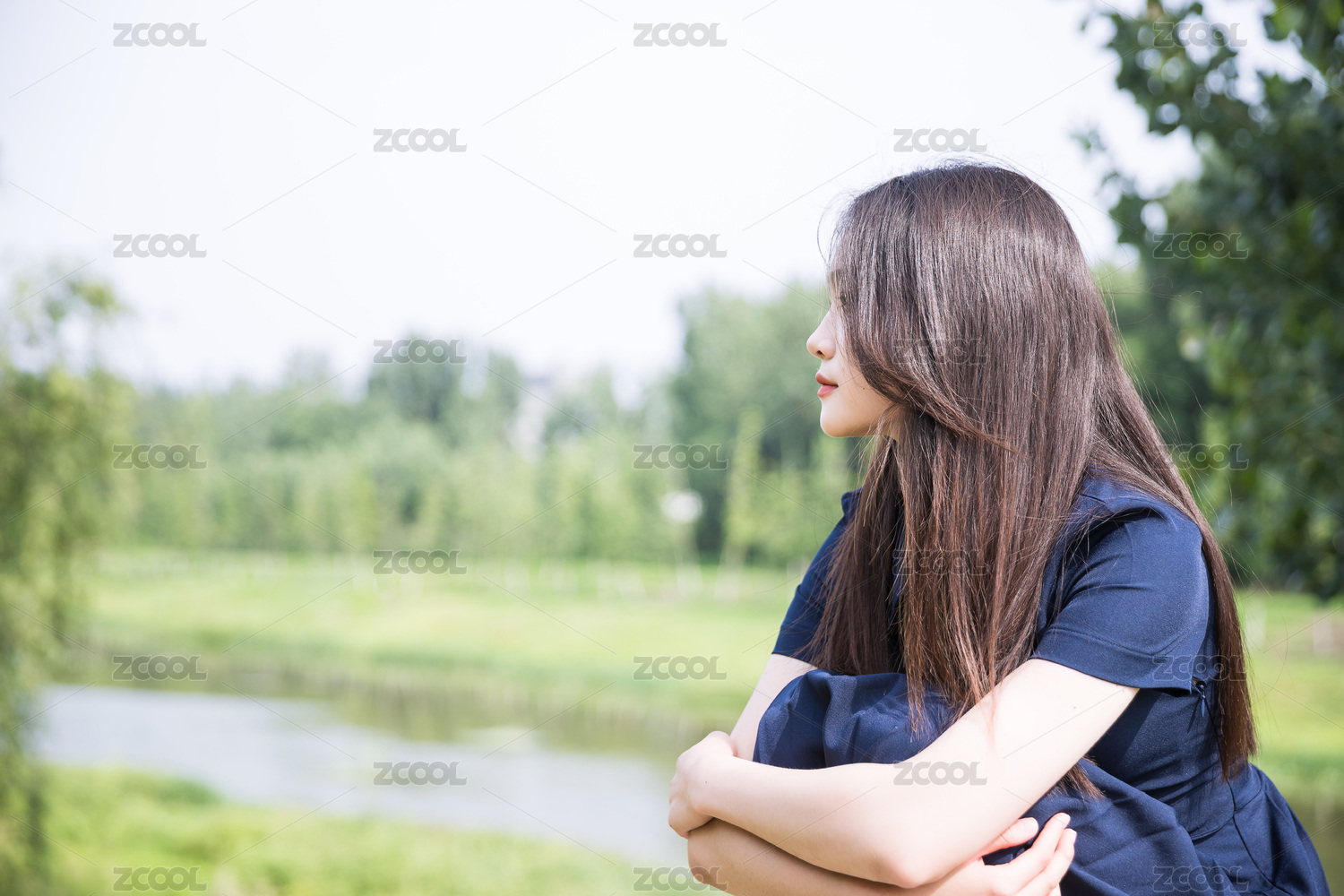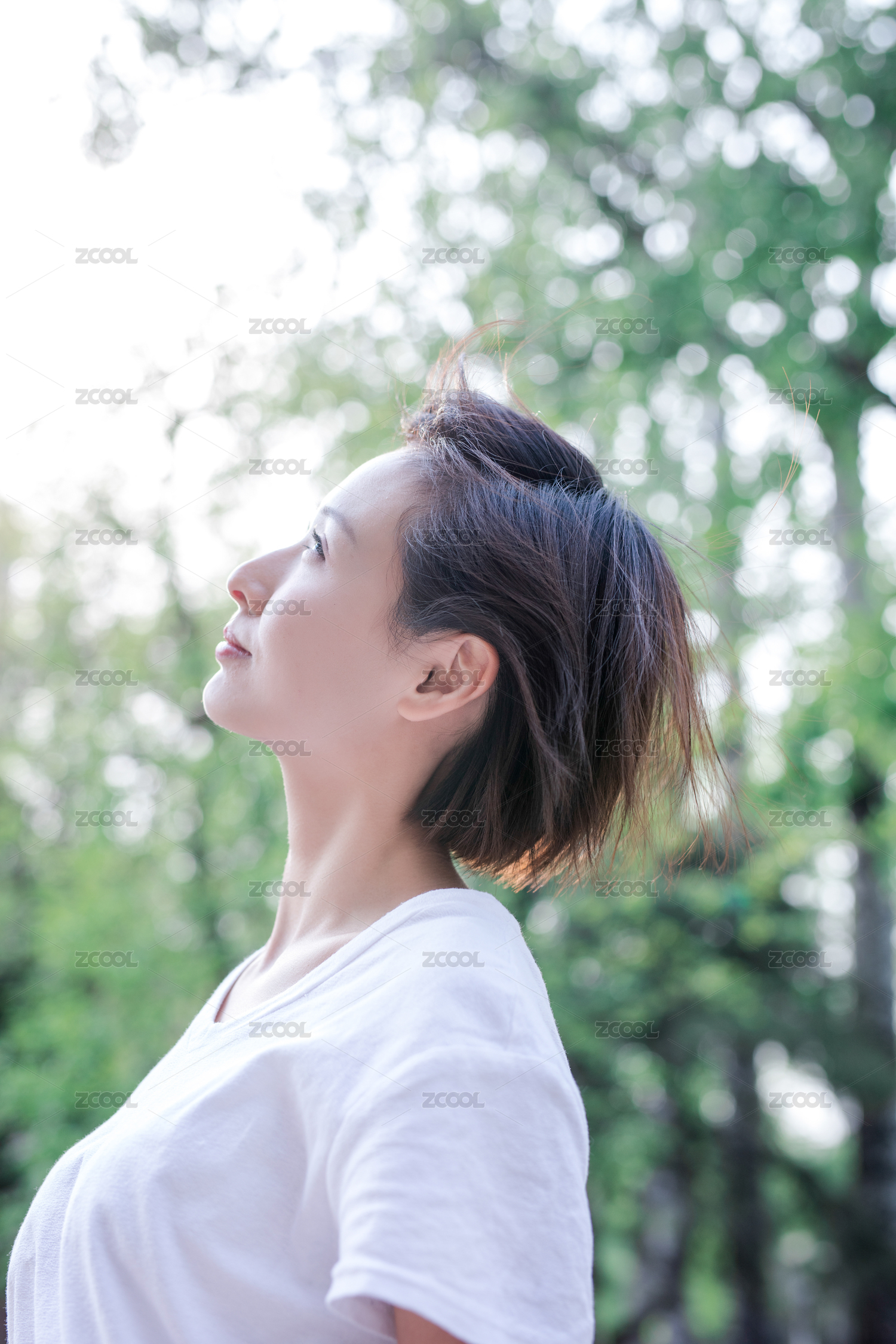 户外公园夕阳下逆光拍摄的亚洲美少女