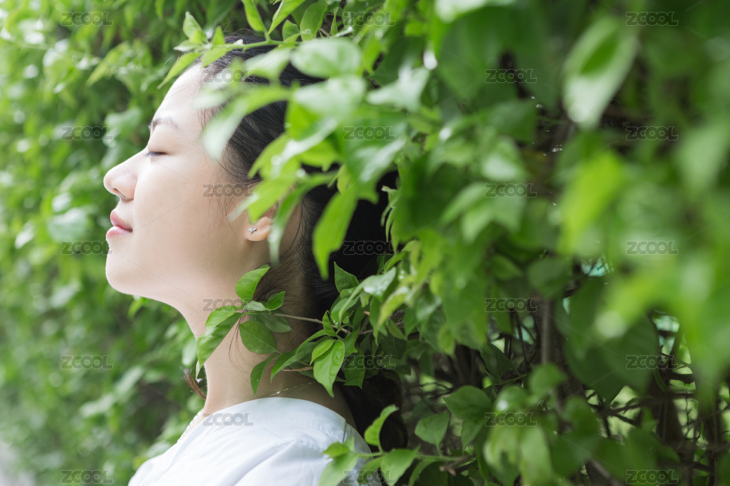 美丽优雅的亚洲女性坐在草地上,夏日午后的花园里,中国古典花园