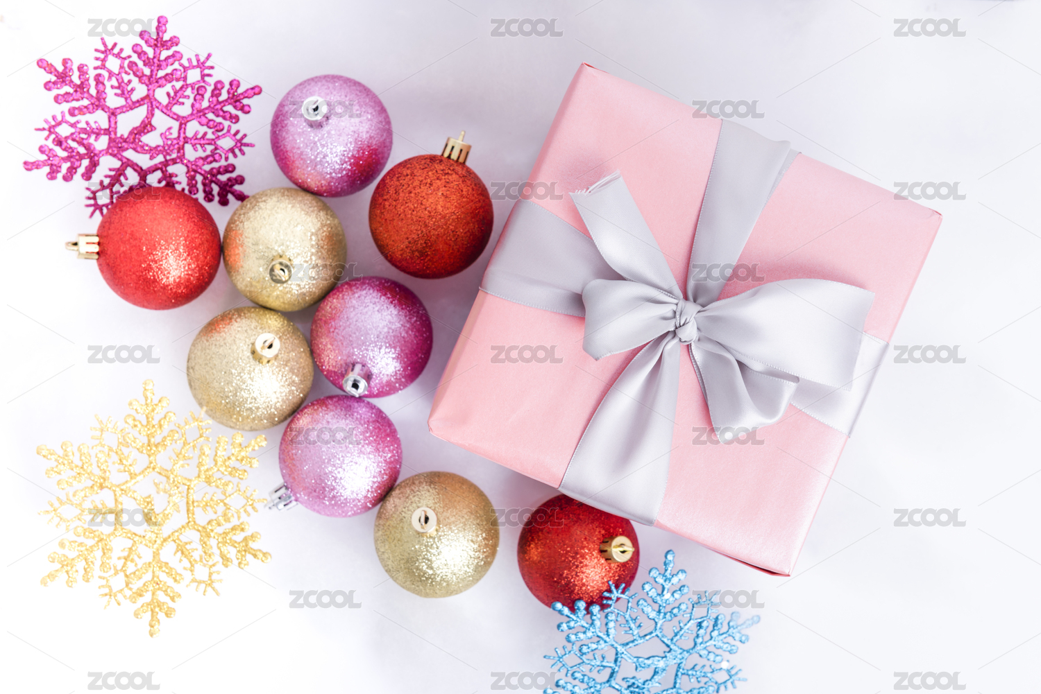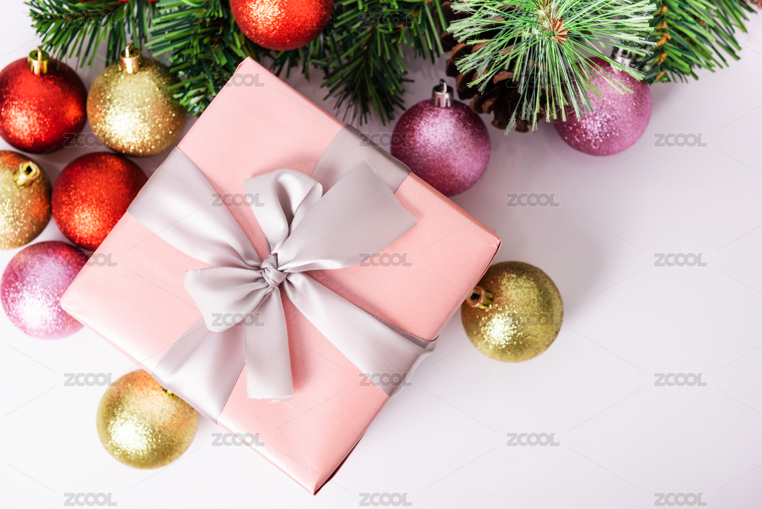 圣诞节装饰品,圣诞球和圣诞礼盒在白色的背景上