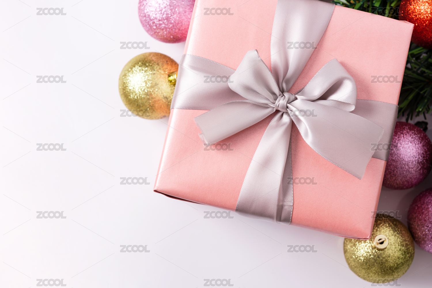 圣诞礼盒和圣诞节装饰品在桌子上,圣诞节节日礼物背景,粉色的礼盒和圣诞树,圣诞球,松果在桌子上