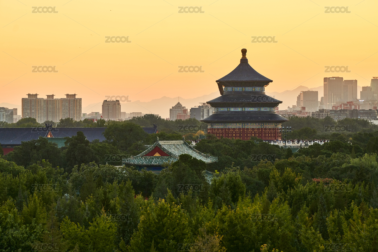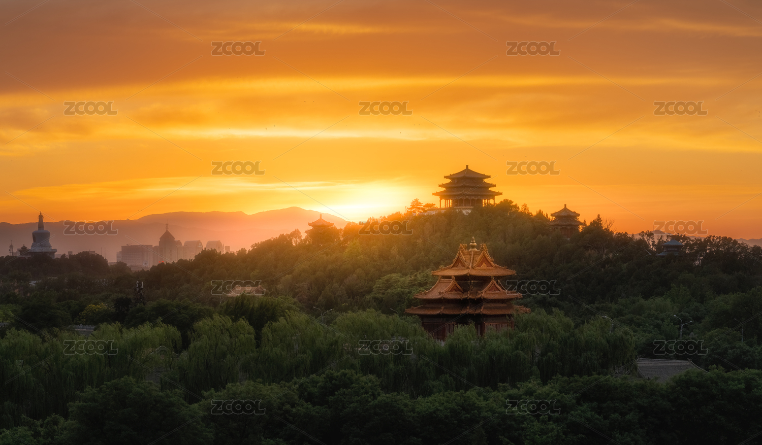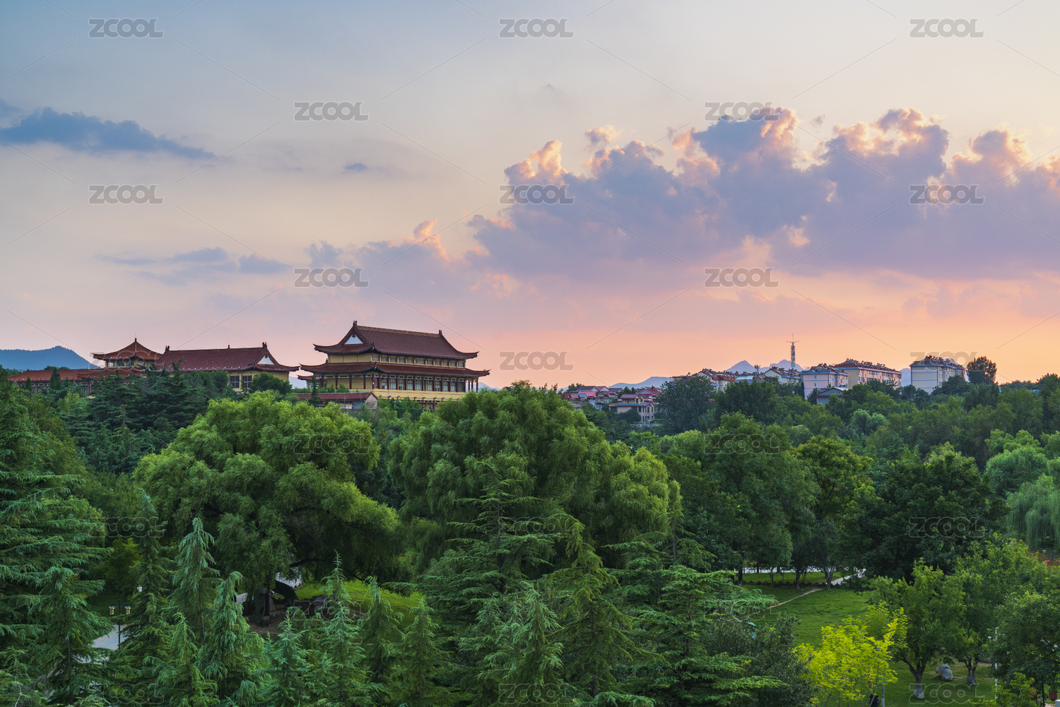 中国山东青州傍晚的彩霞绿色的树林古建筑风景