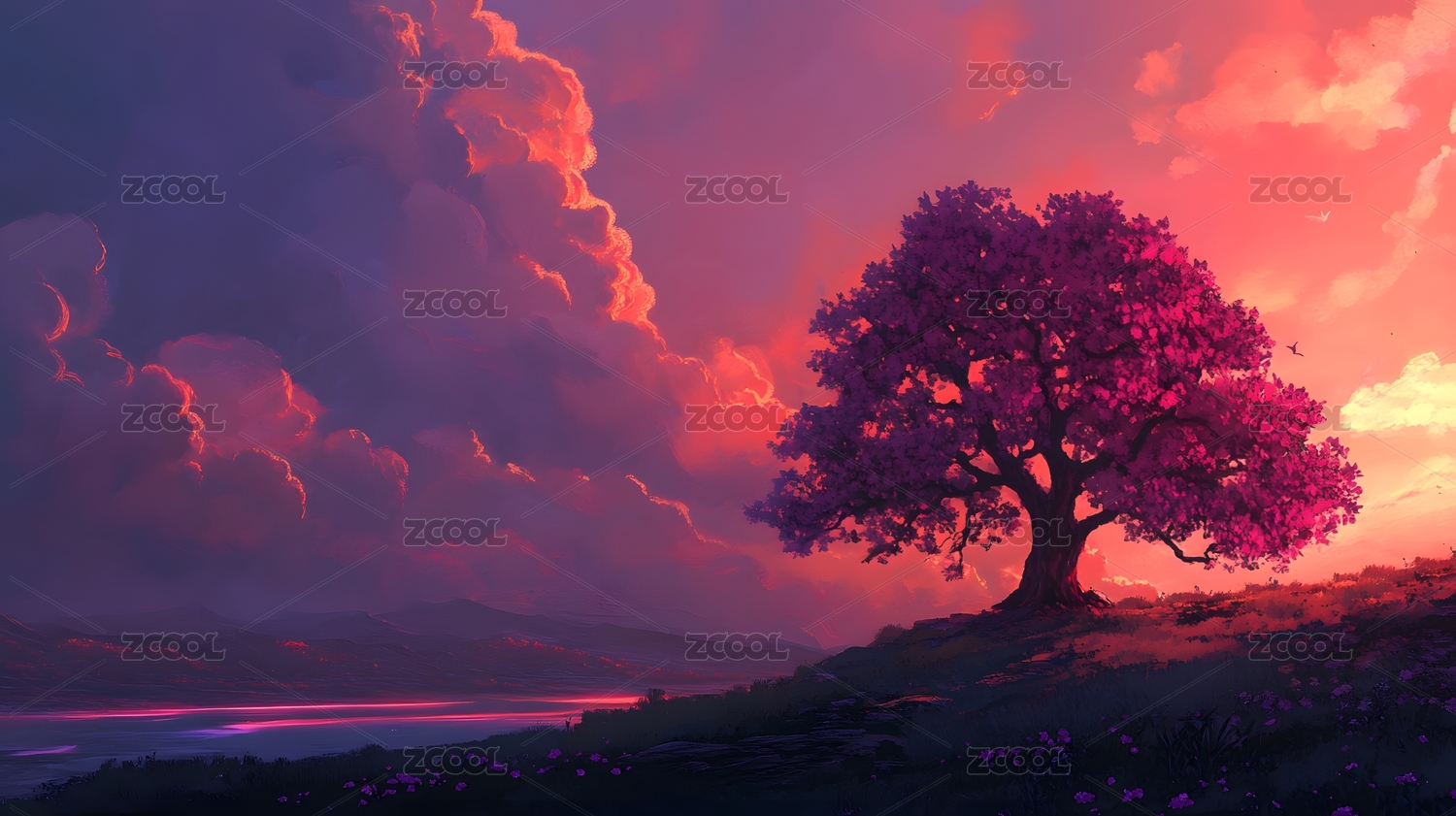云层,云,树,一棵树,夕阳,天空,草地,红叶,红色