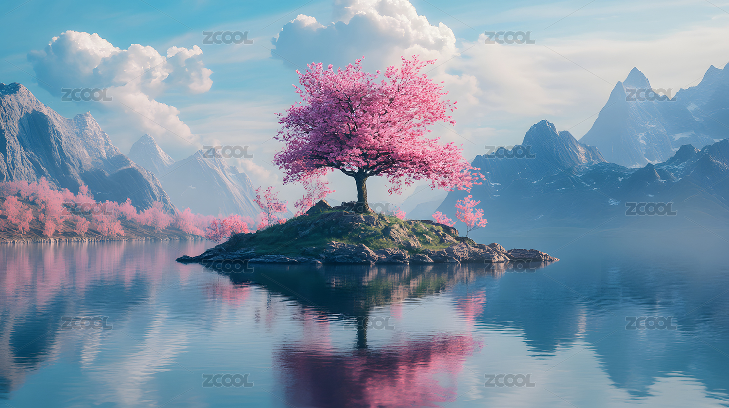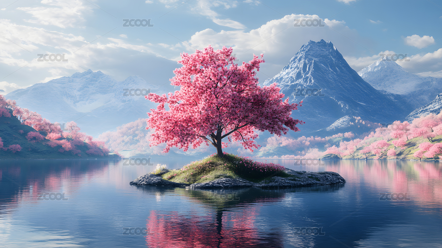 雪山湖畔樱花树