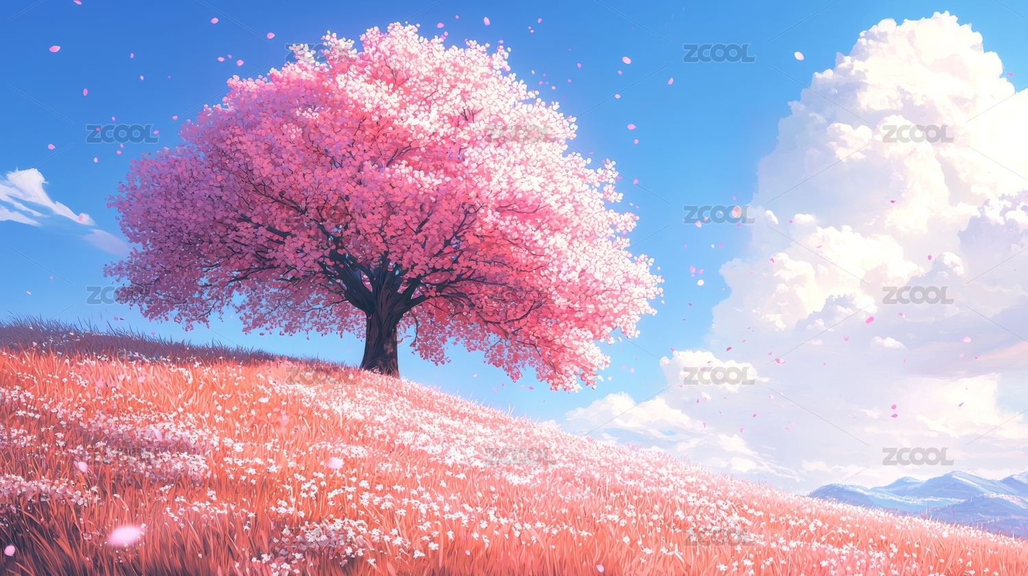 粉色樱花树在山丘上
