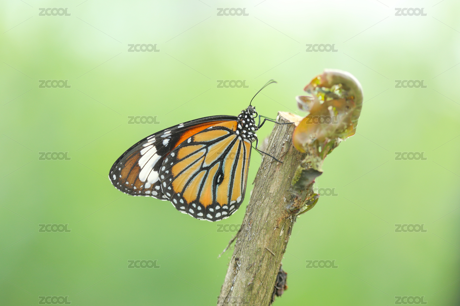 逆光绿背景下一只停栖在树叶上的蝴蝶