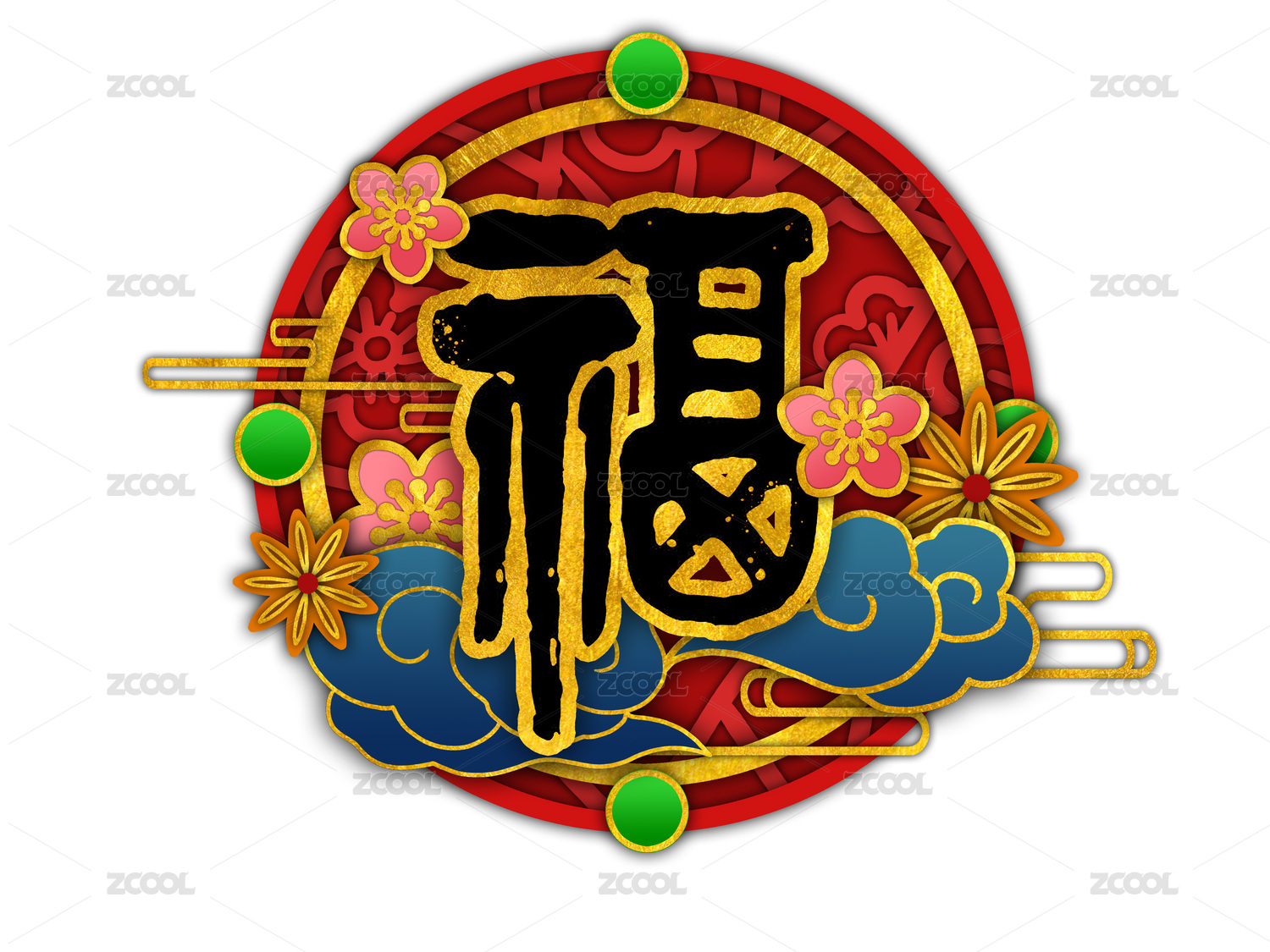 剪纸风福字花朵祥云