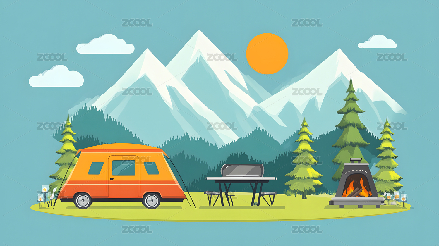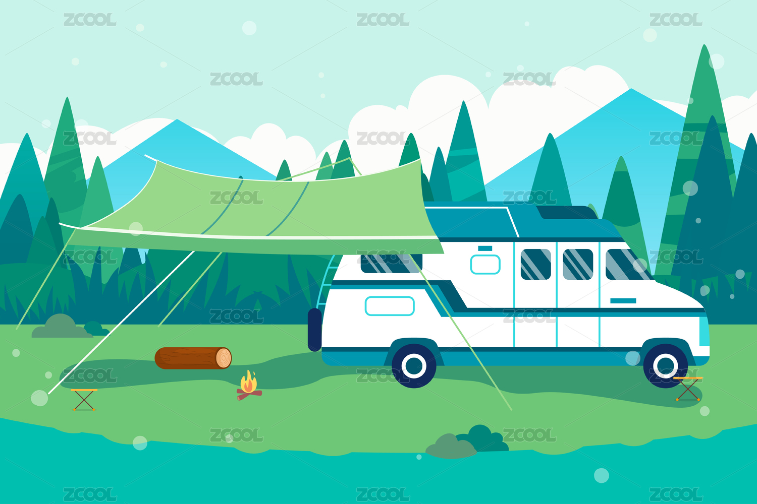 夏天假期自然景观冒险旅途复古旅行场景插画