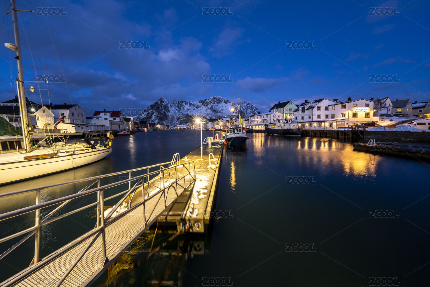 挪威罗弗敦群岛亨宁斯维尔夜晚城市灯光夜景