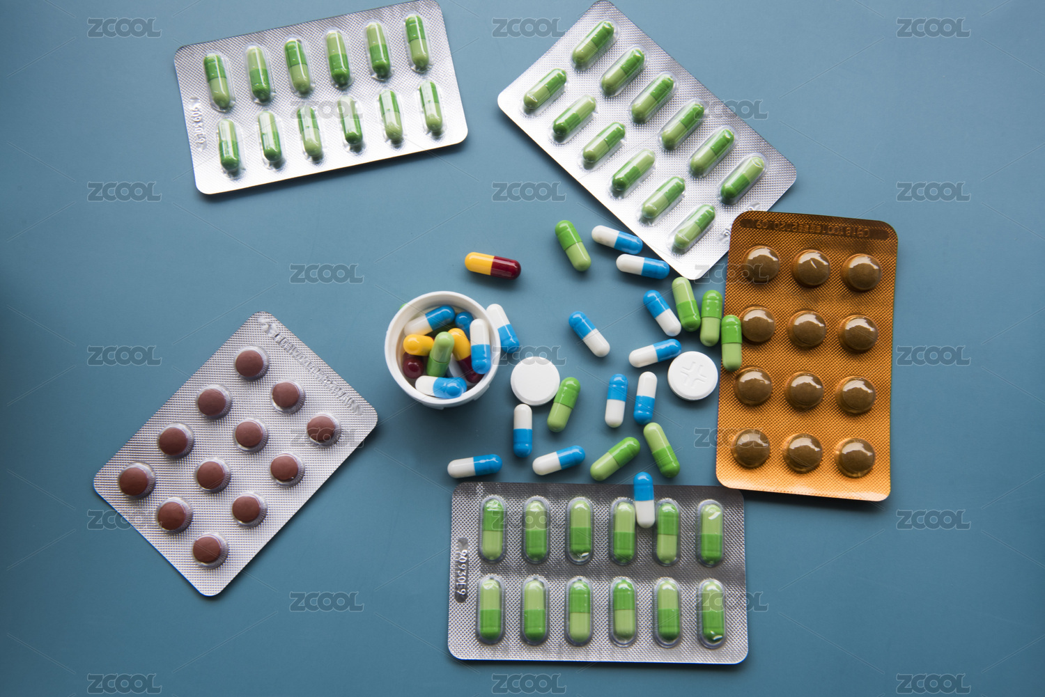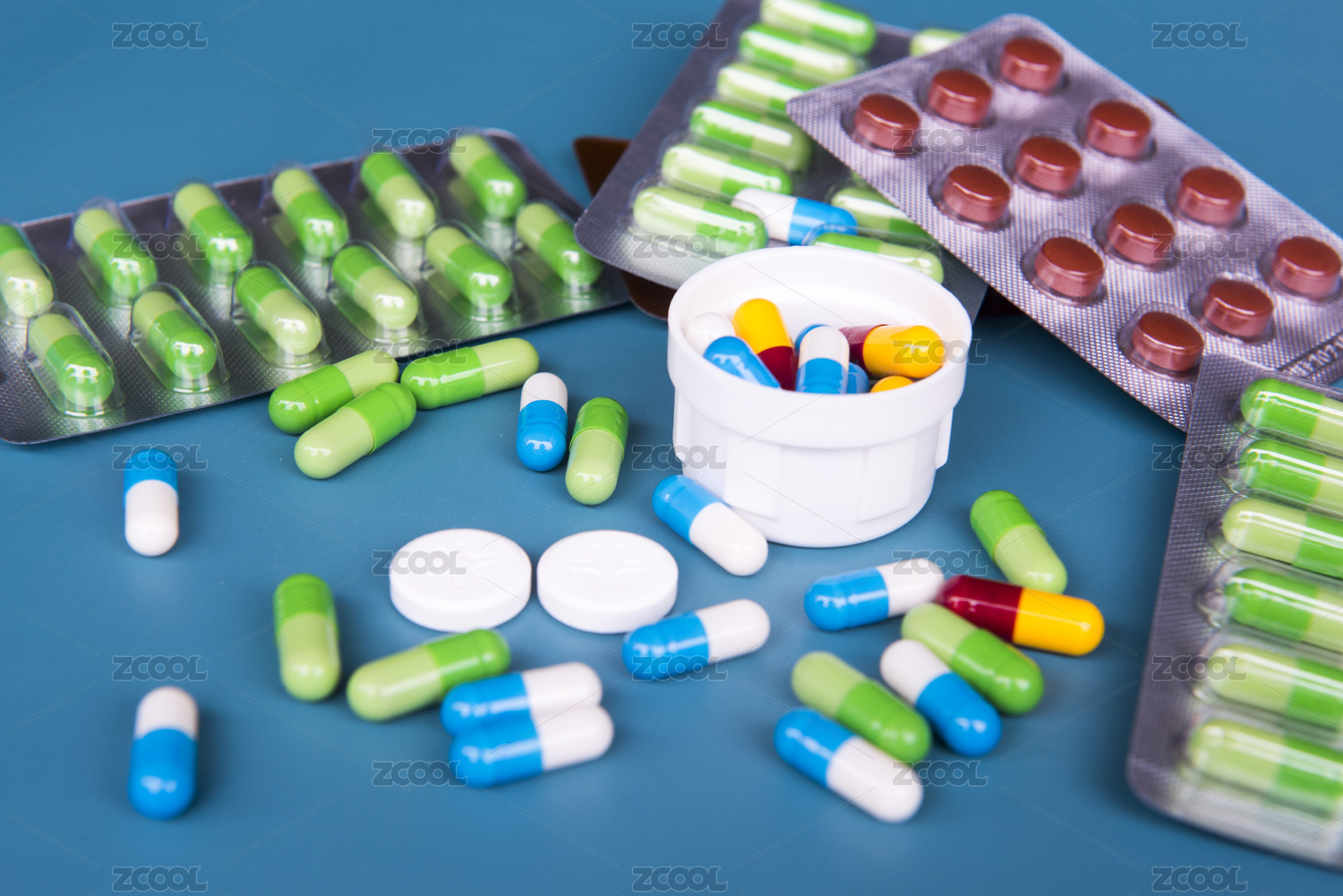 在蓝色背景上用于医疗治疗用中西药药丸胶囊