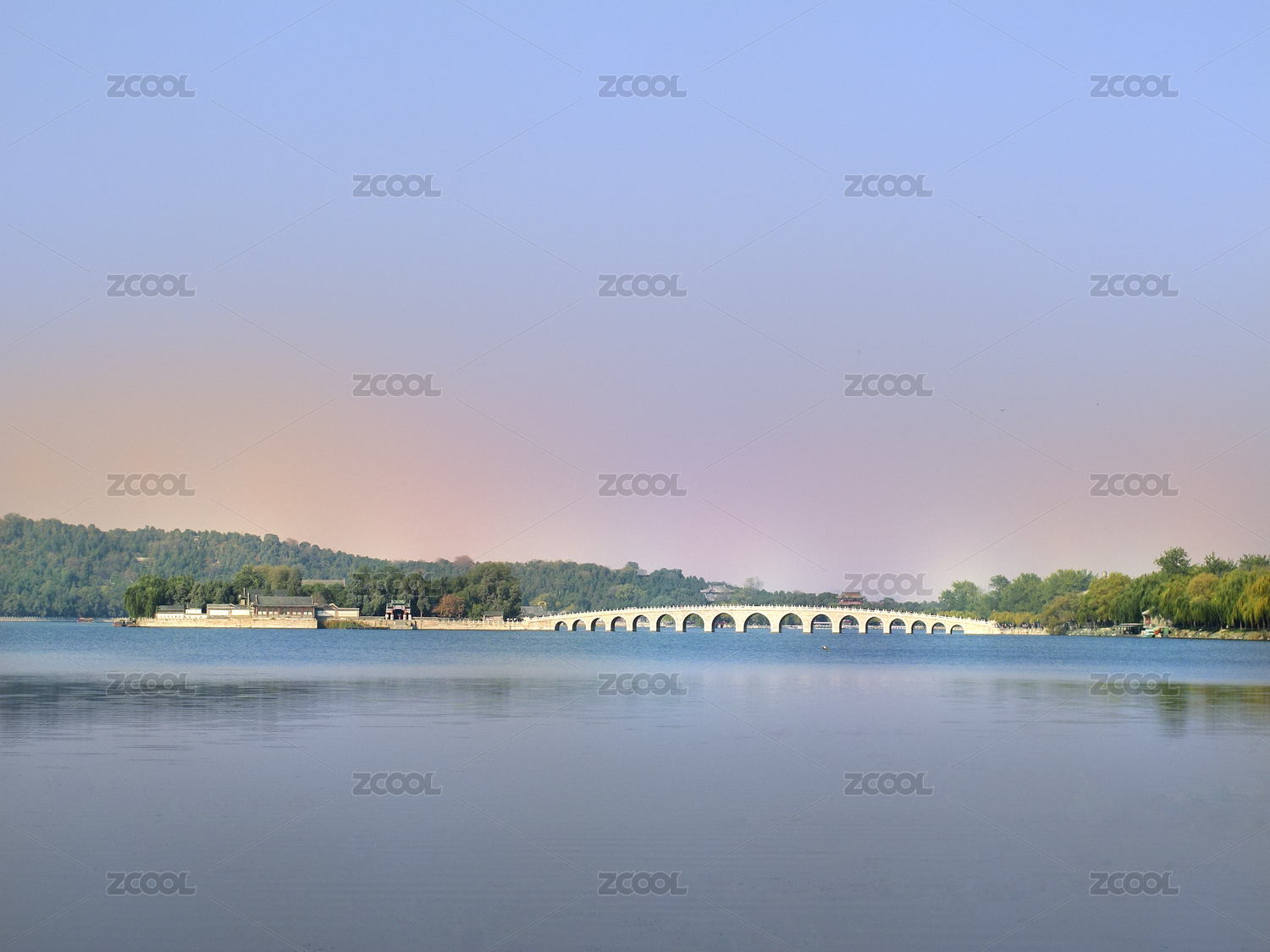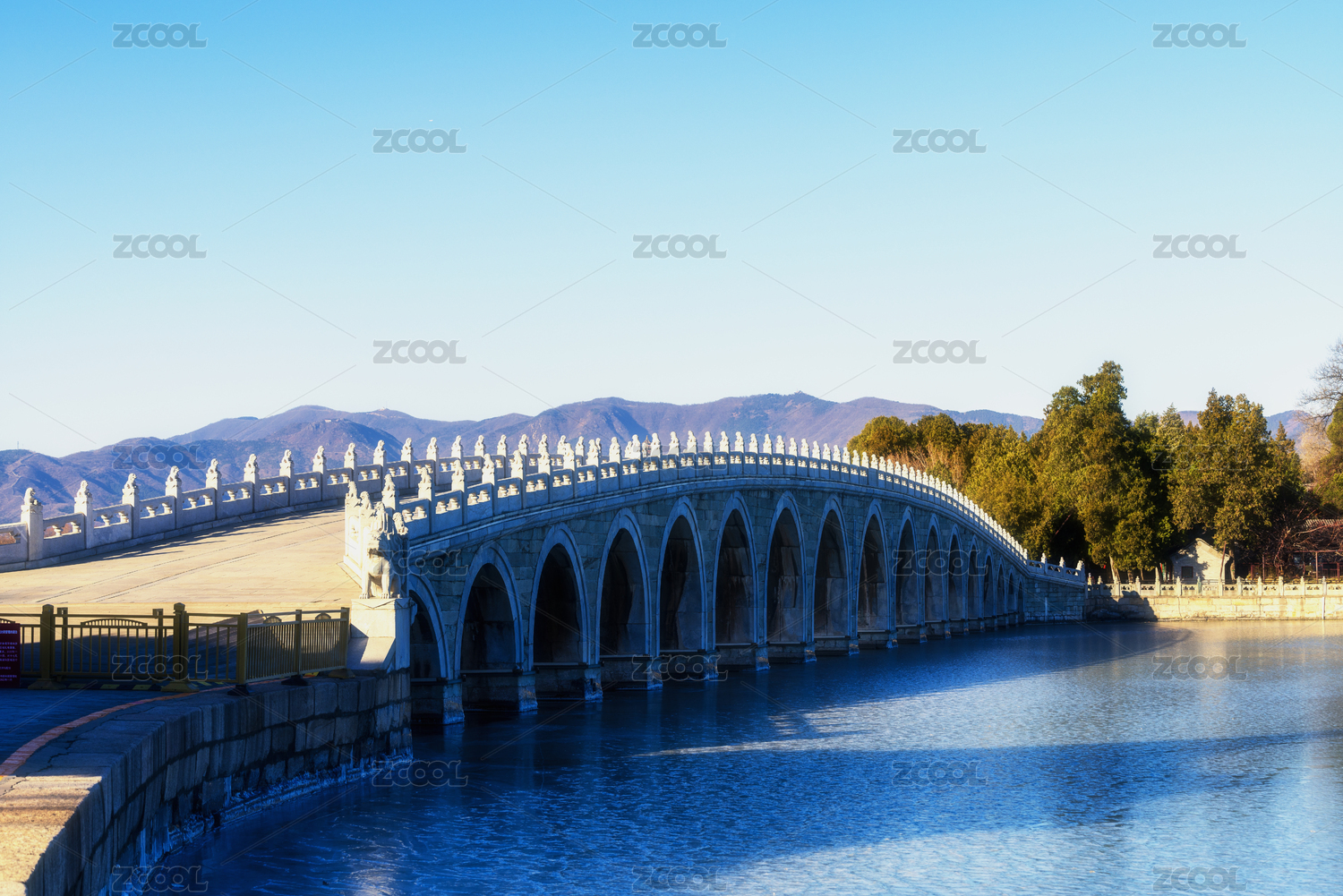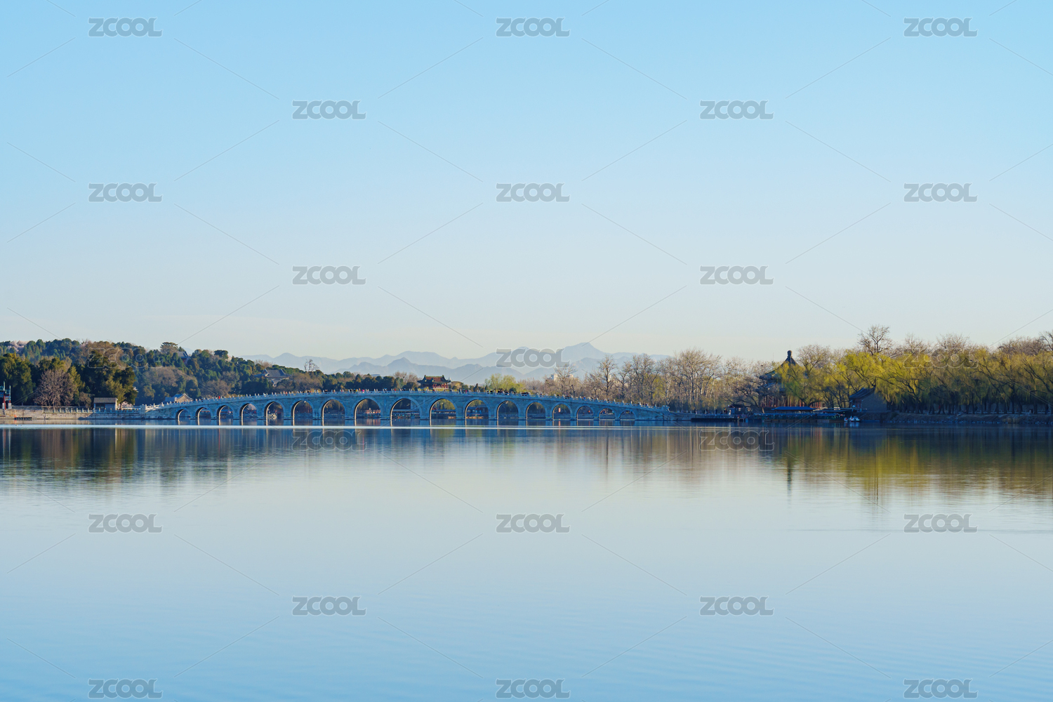 清晨阳光下的颐和园十七拱桥与远处的群山