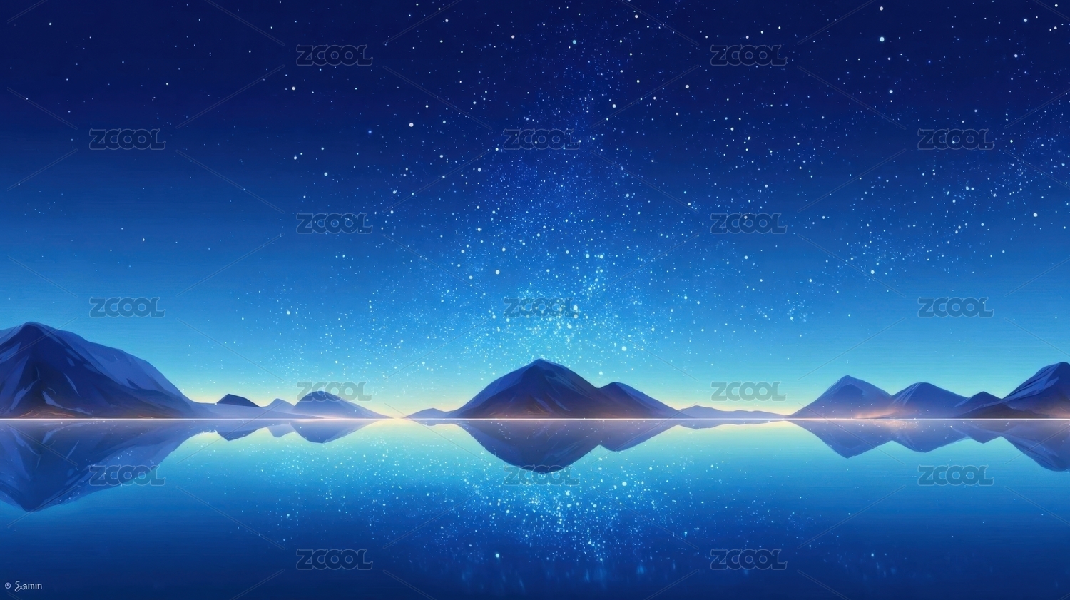 星空,山脉,湖面,反射,夜晚,光线,云层,道路,自然,风景