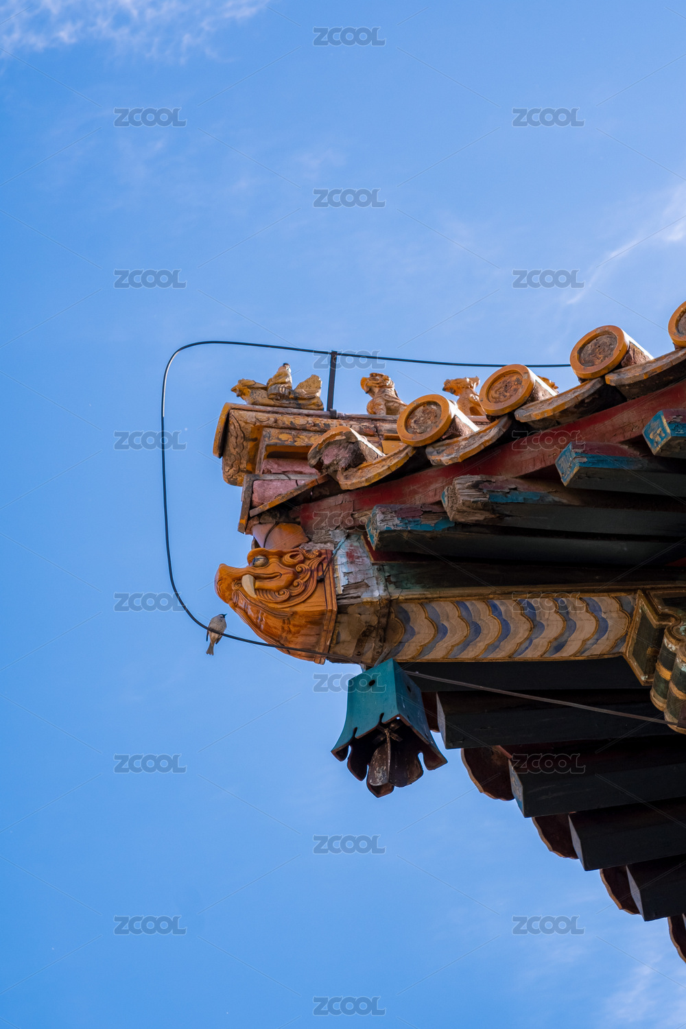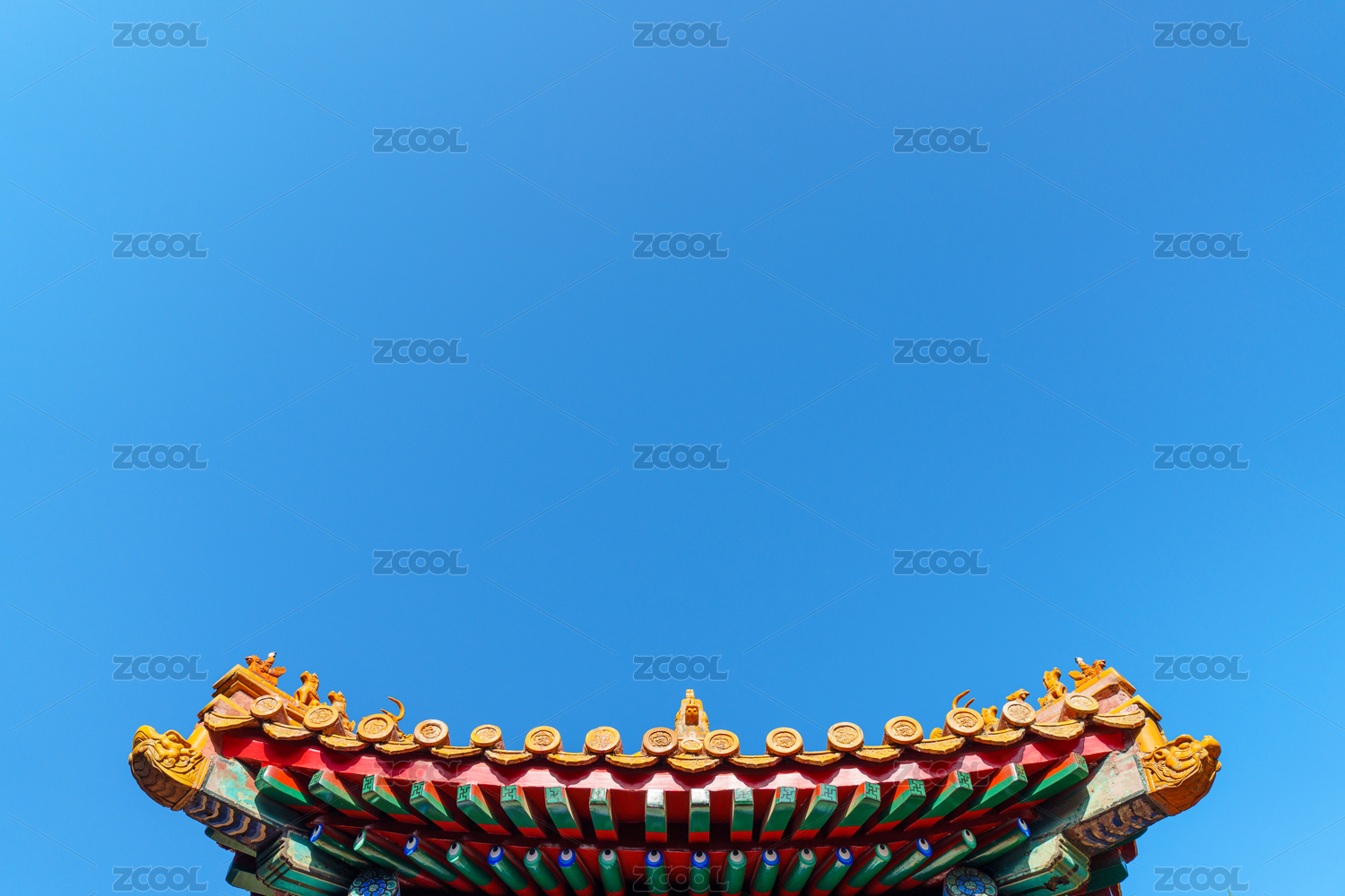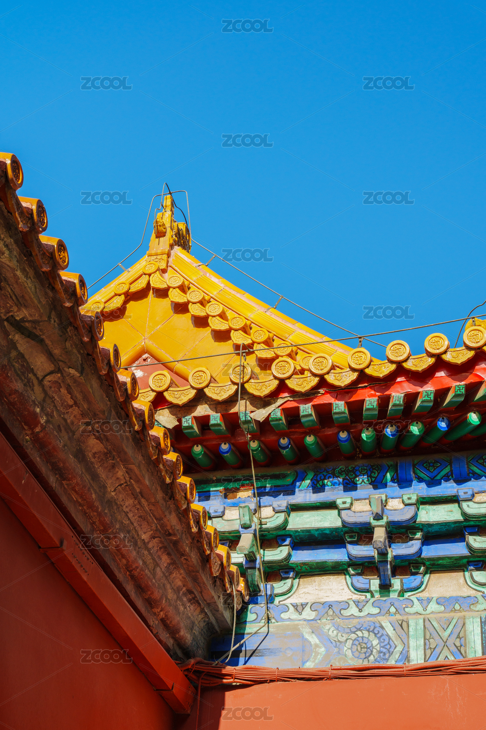 蓝天下的北京中山公园宰牲亭屋顶房檐特写