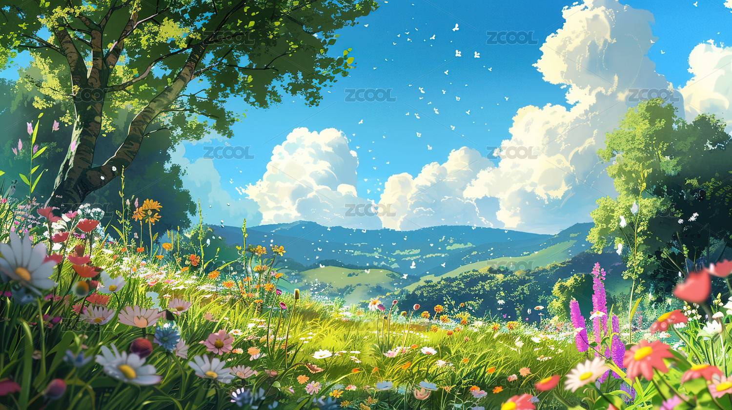 绿树白云下的草地风景