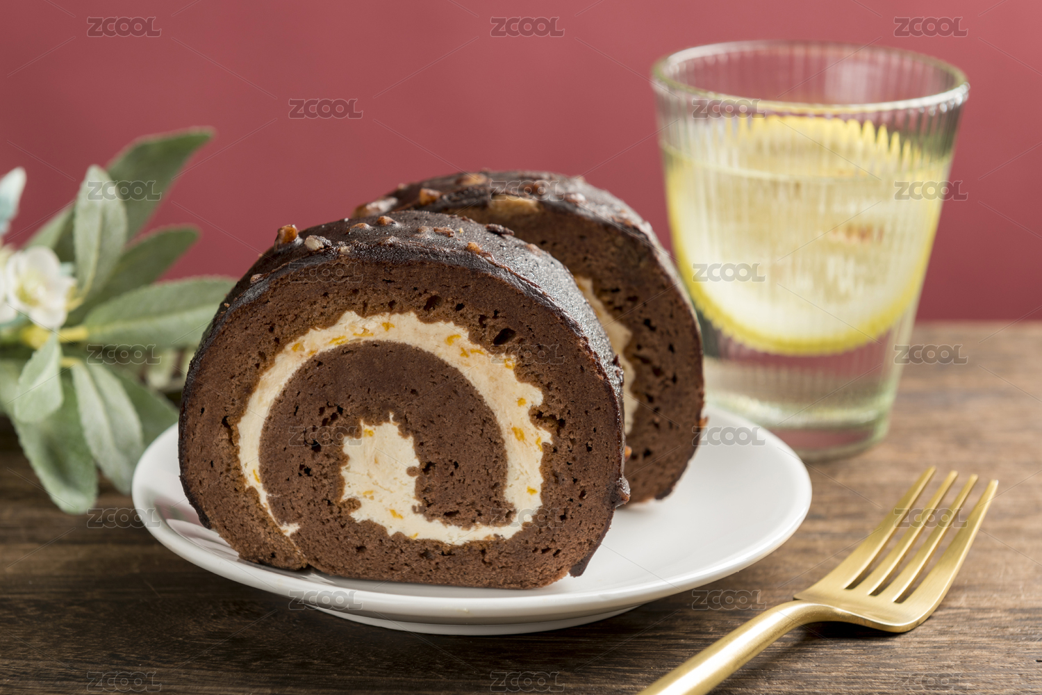 巧克力瑞士卷蛋糕摆放在桌面上特写