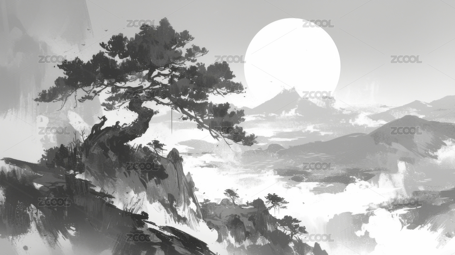 暗黑魔幻万圣节黑白闪电高山枯木插画背景