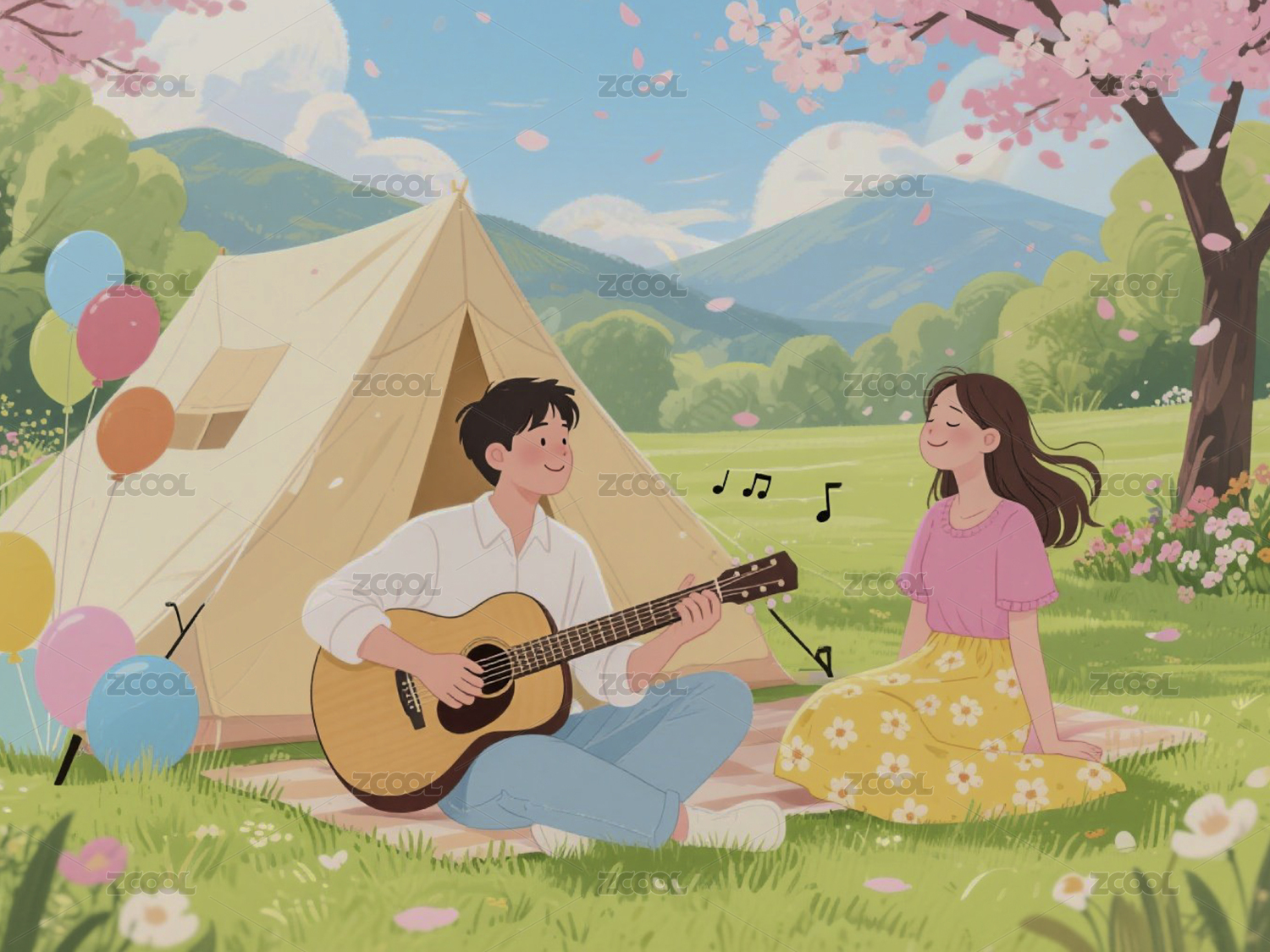 夏季休闲露营帐篷朋友户外野餐青年节插画