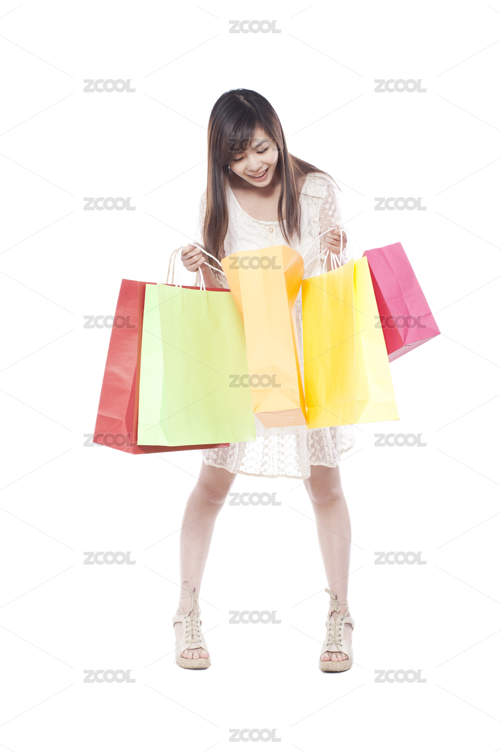 面带微笑的年轻美丽女性拿着购物袋,全身肖像