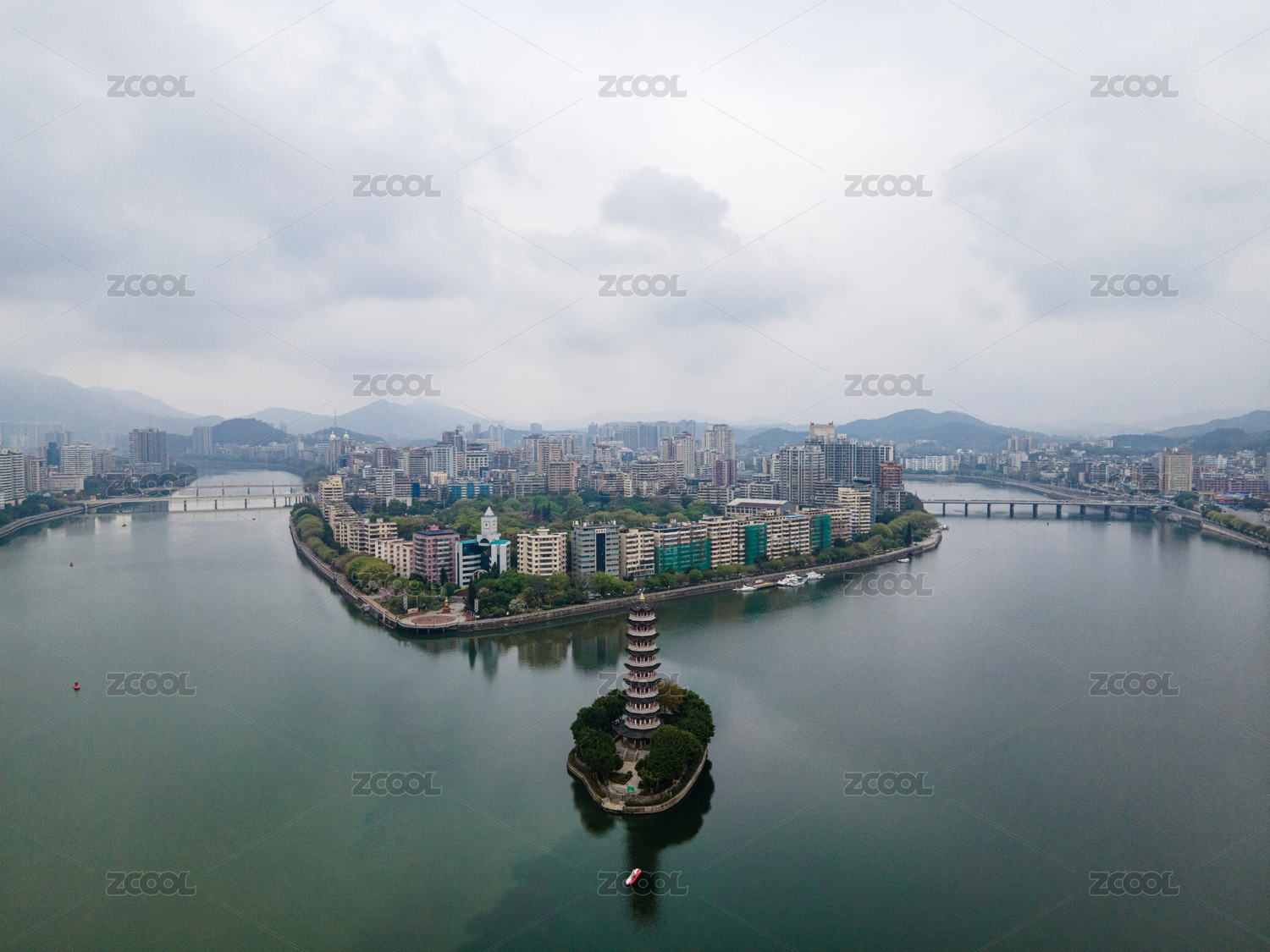 夕阳下航拍浙江省台州市天台县始丰湖公园