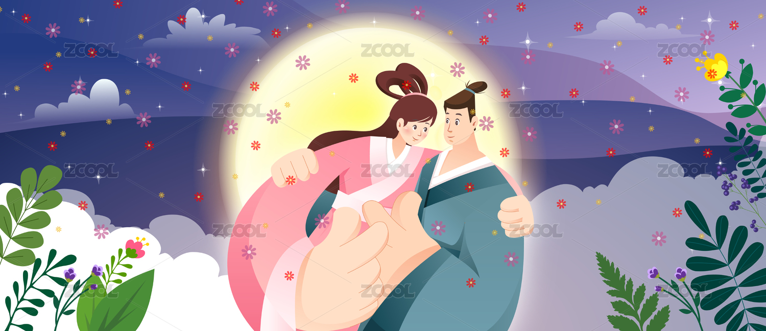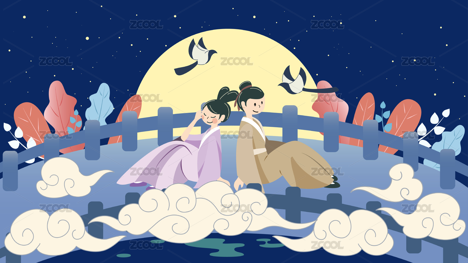 七夕牛郎织女相会国潮宽屏矢量插画海报