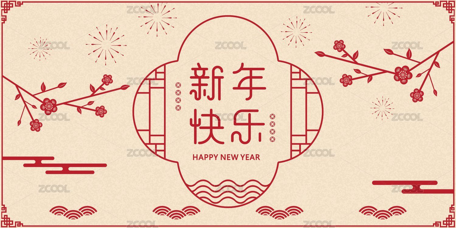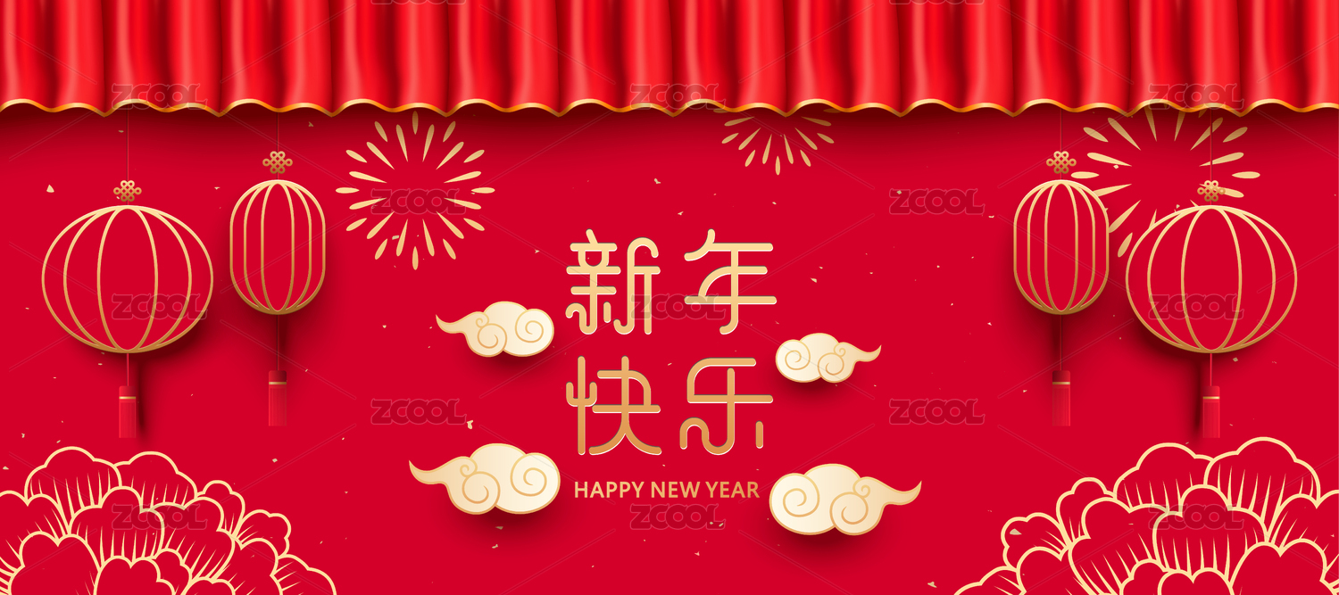 中国传统新年元素,金色背景图,新春对联—新年快乐,红色灯笼和祥云图案