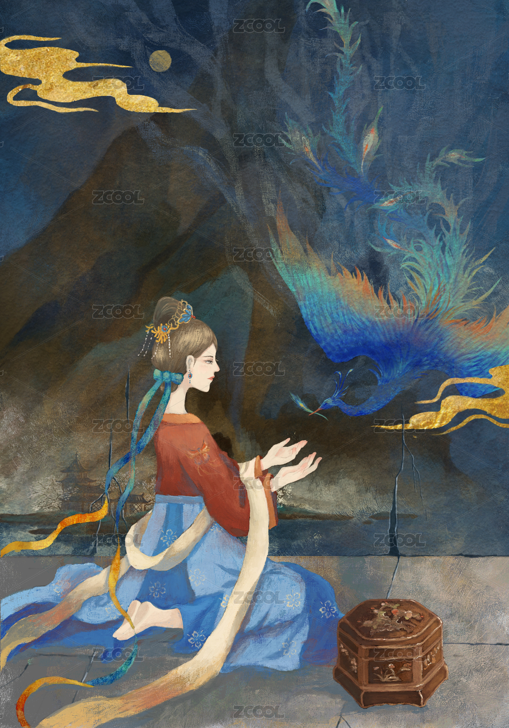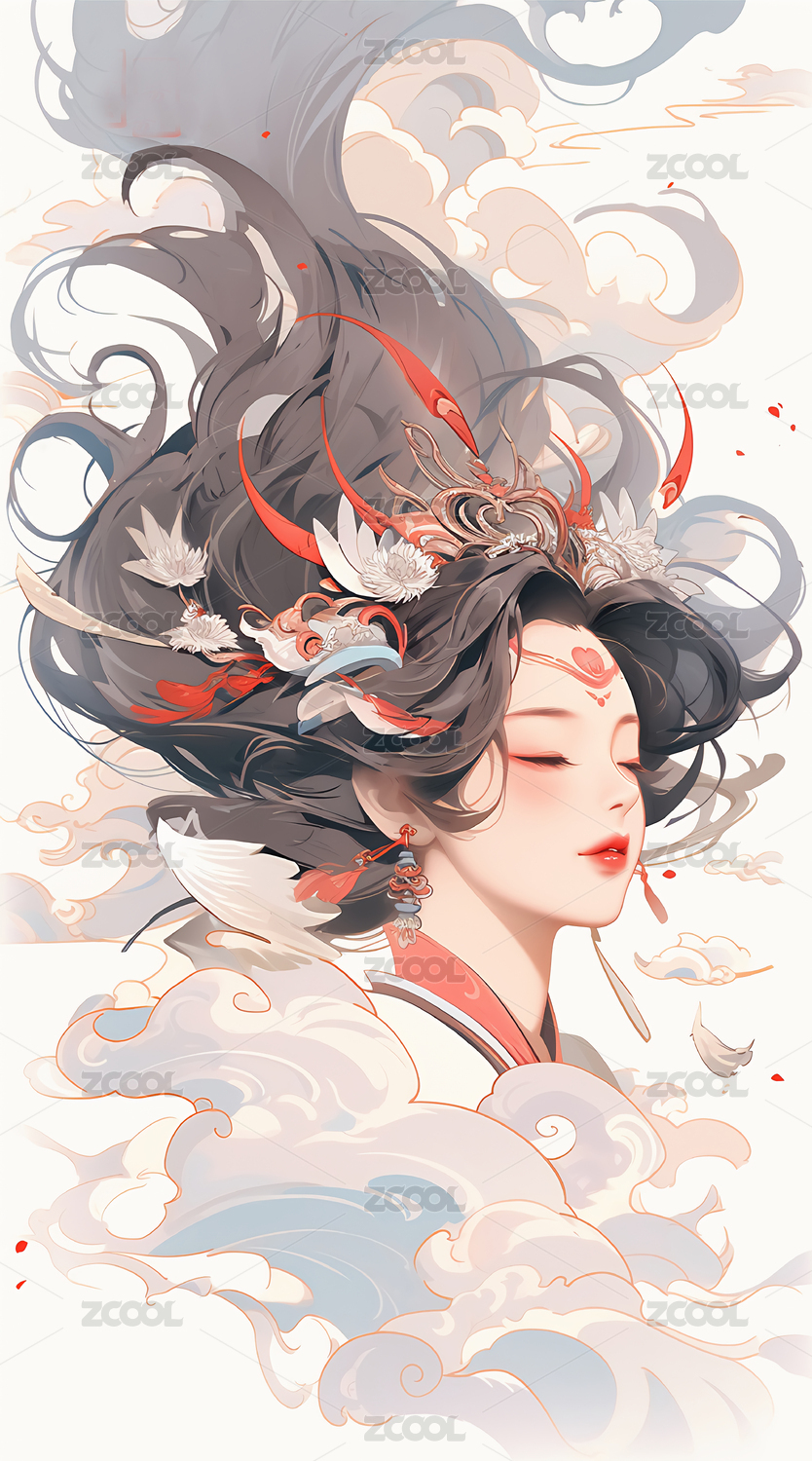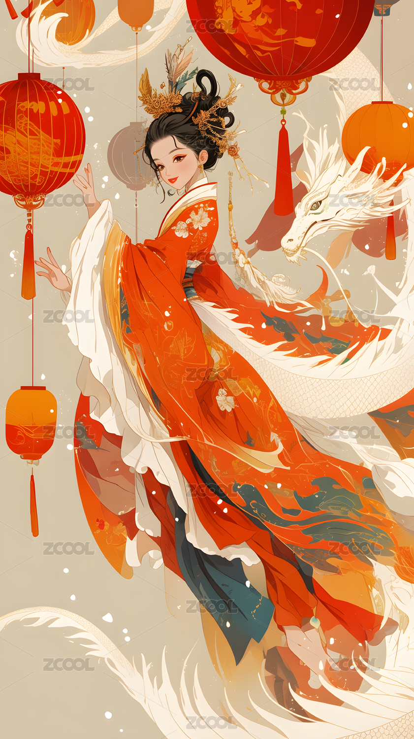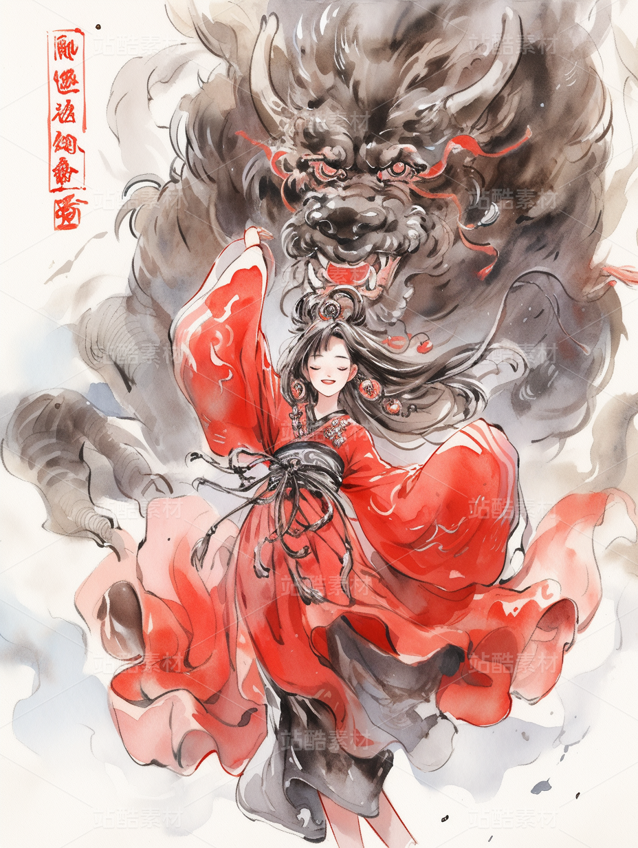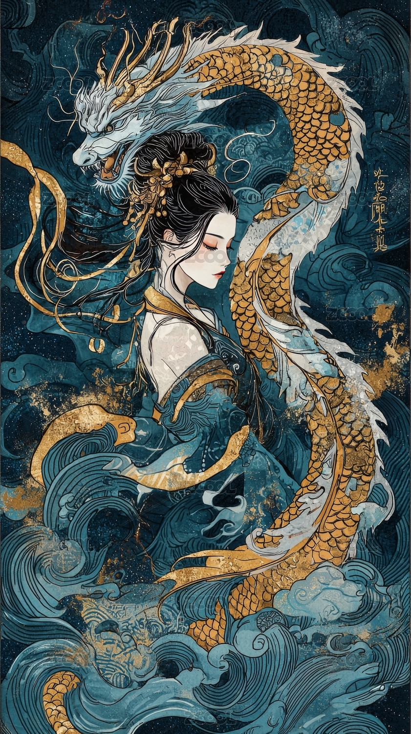 东方女性与龙的艺术插画