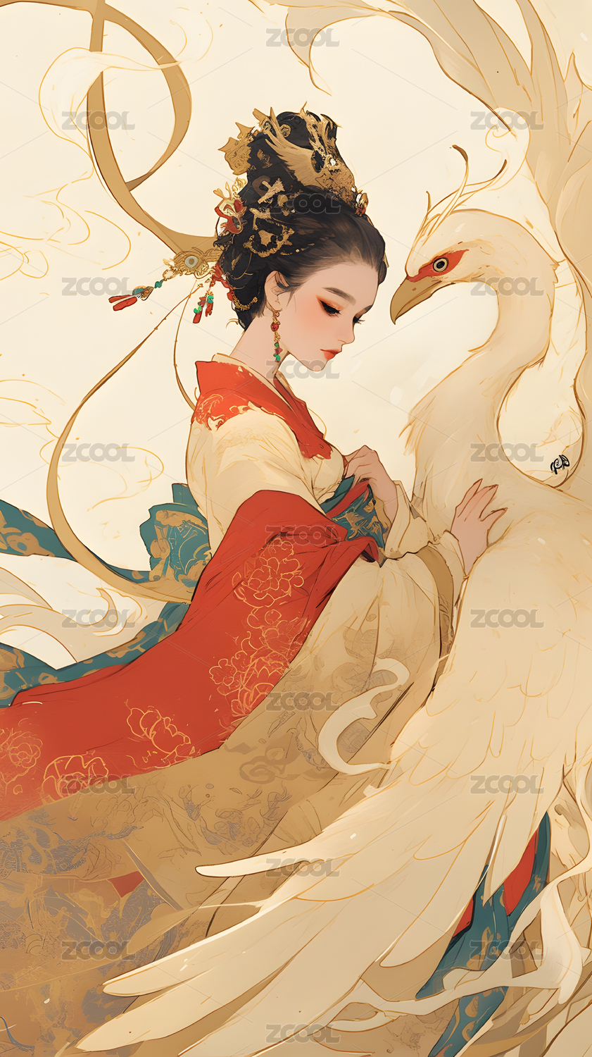 古风女子与神鸟壁画