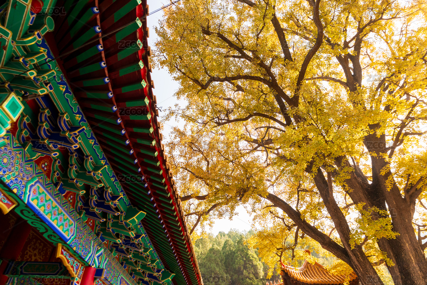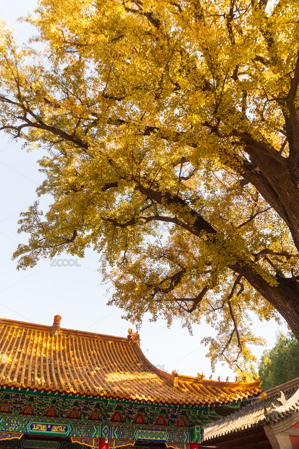 山东济南淌豆寺秋天黄色千年银杏树叶子金黄