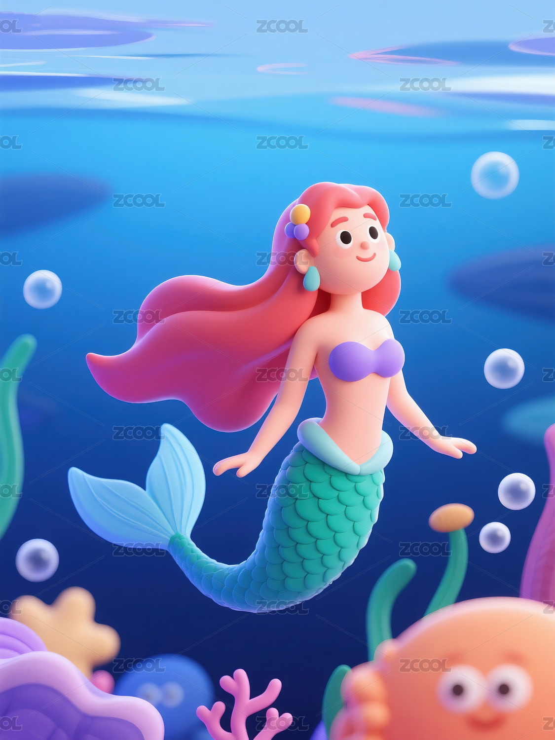 红发美人鱼在梦幻海洋中欣赏珠宝