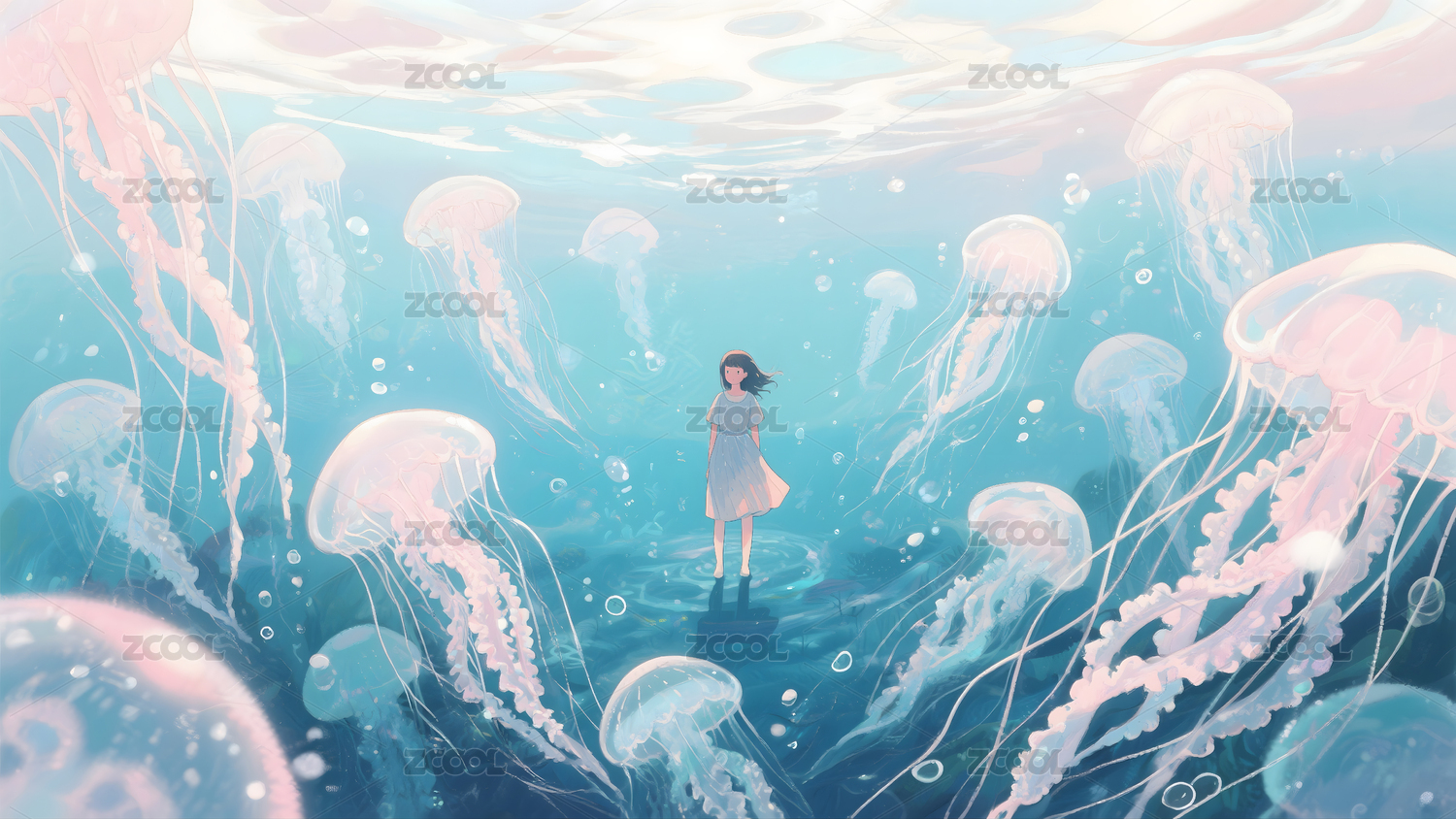 海洋,水母,海洋生物,女孩,绘本,夏季,旅游,可爱,探险