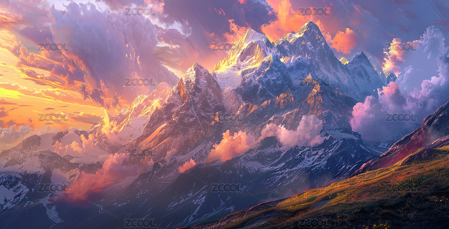 雪山峰峦与粉紫色晚霞壮丽景观图
