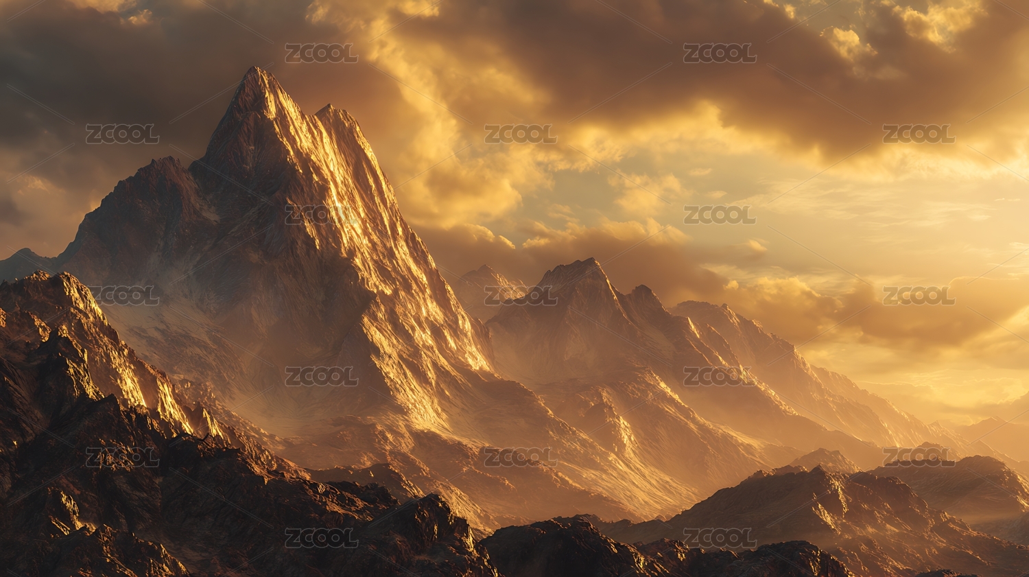 高耸入云的山脉被金色和橙色的阳光照亮