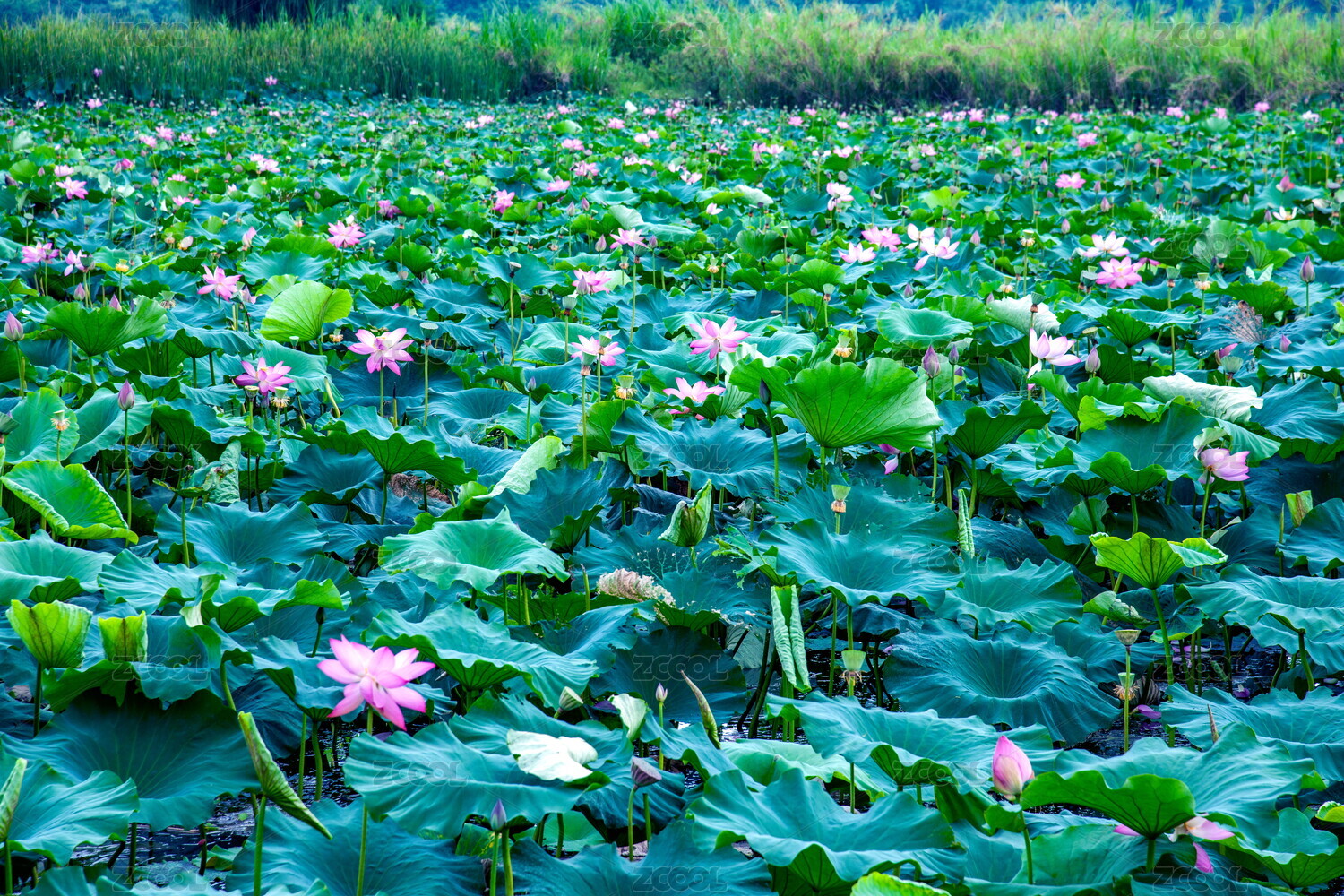 荷花盛开的池塘景象