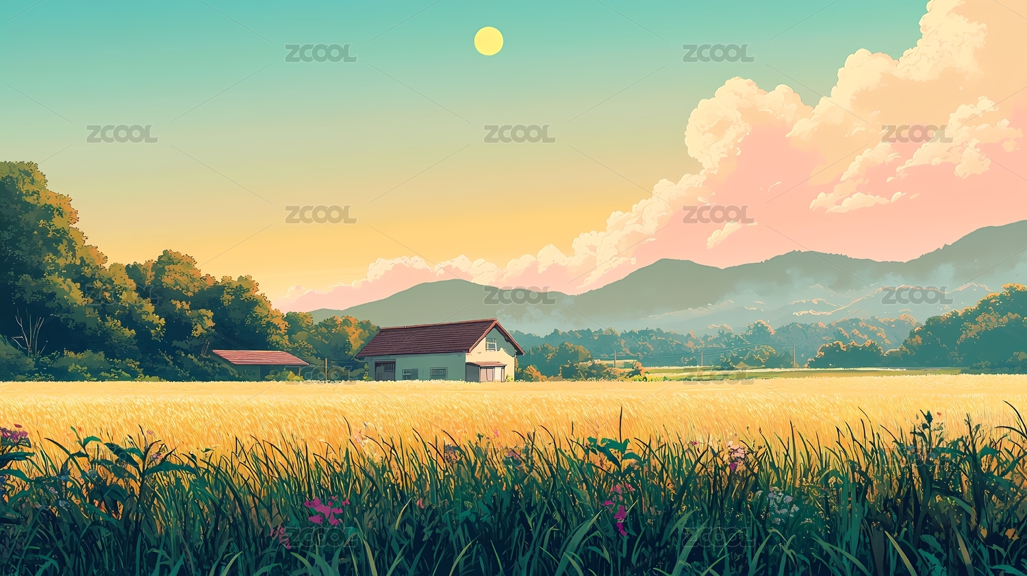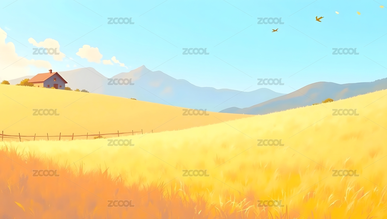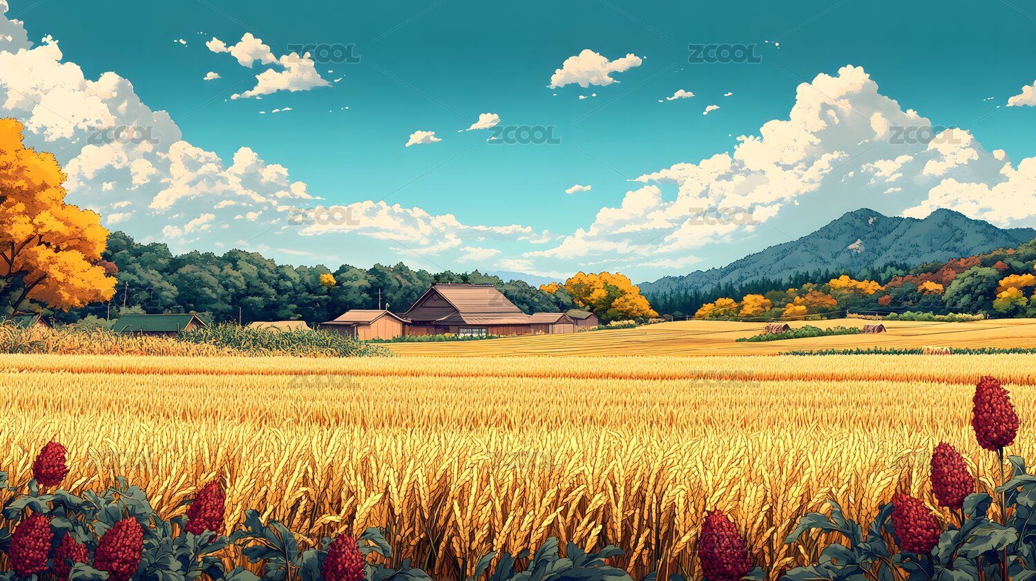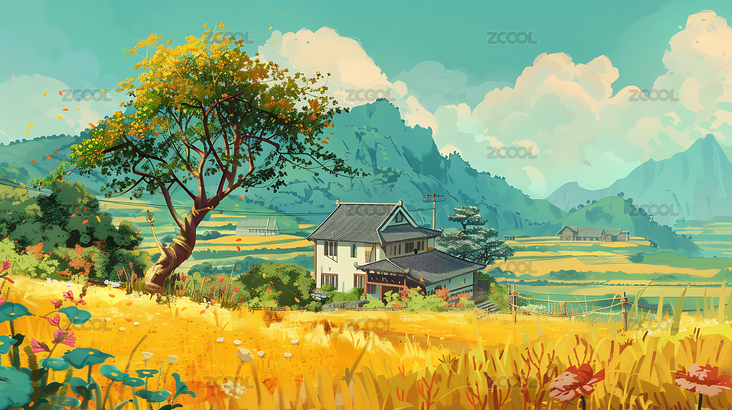 秋天,风景,村庄,水彩,写意,树林,山脉,田野,田地,梯田