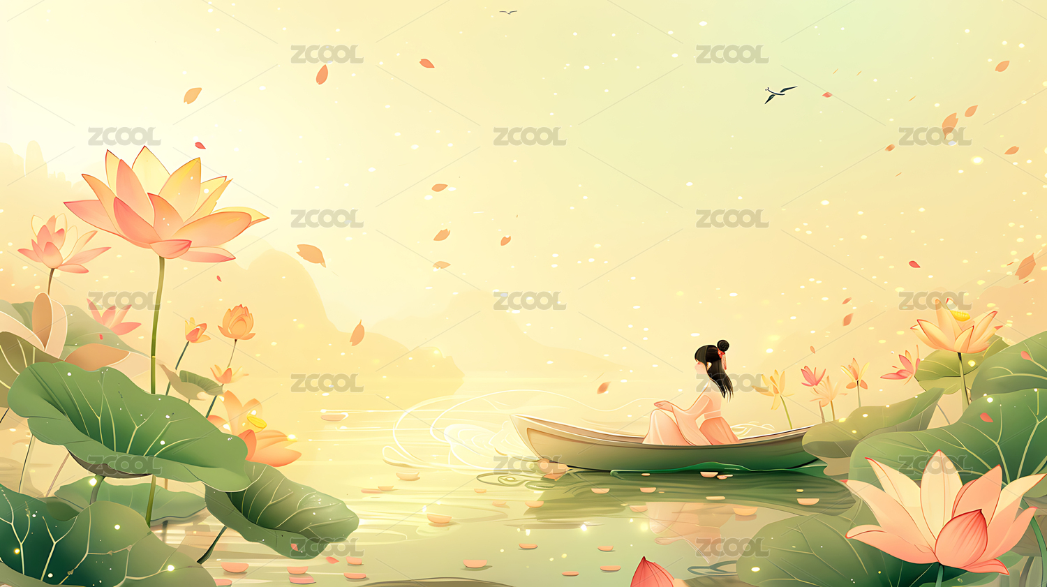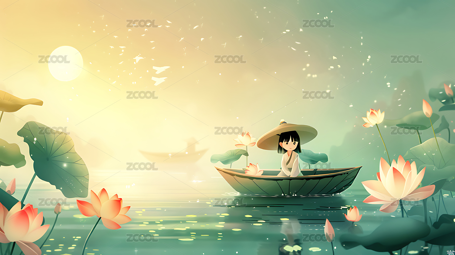 立夏节气,夏天荷花荷叶清新儿童划船人物背