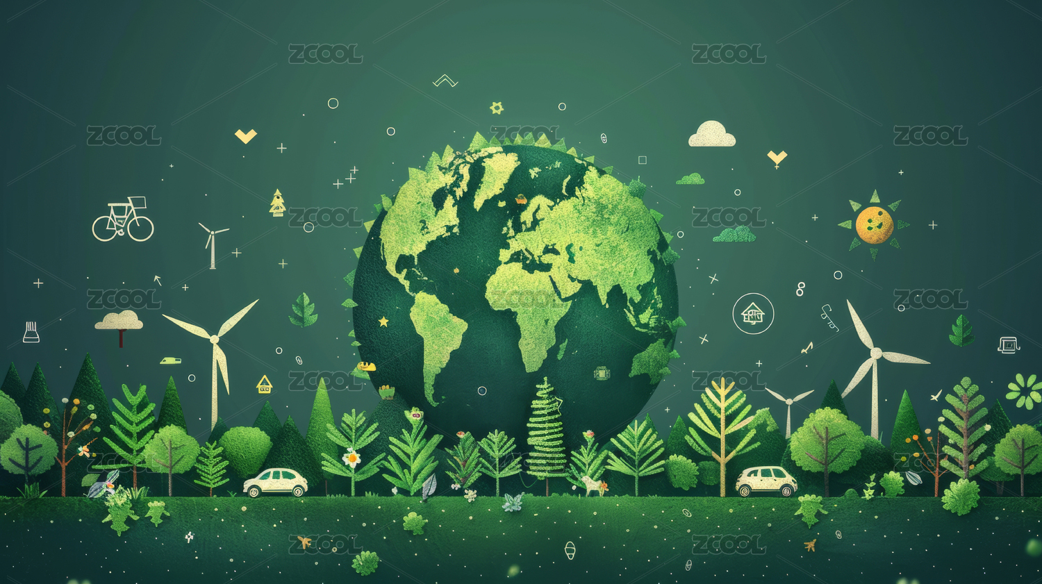 绿色地球、森林和风车,新能源环保主题插画