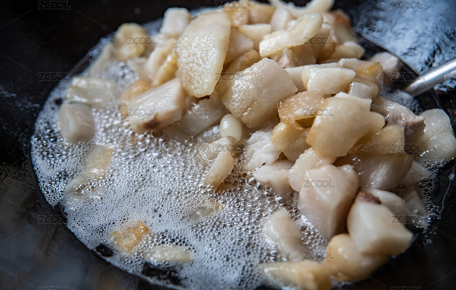一大锅肥猪肉在铁锅里炼制猪油