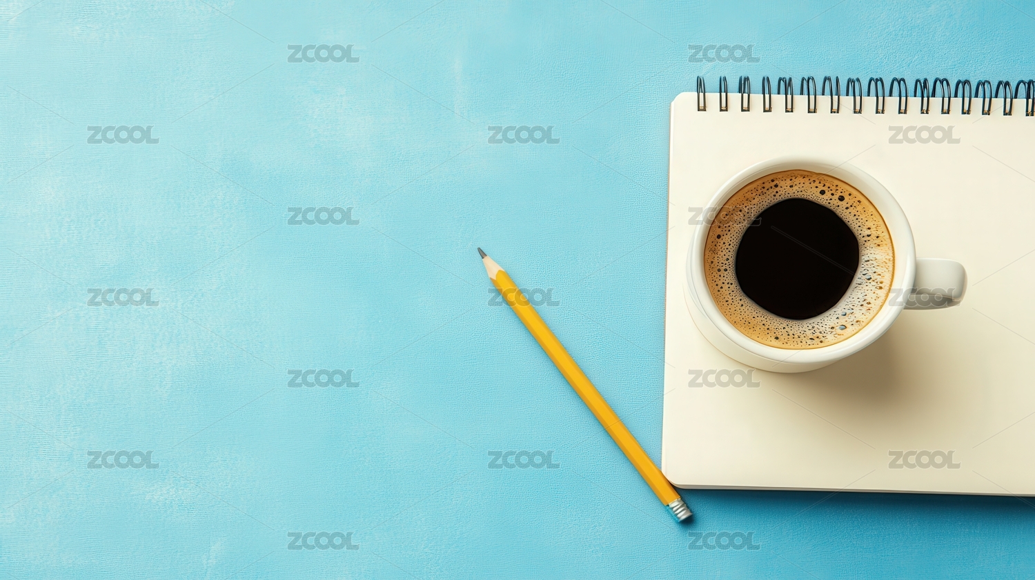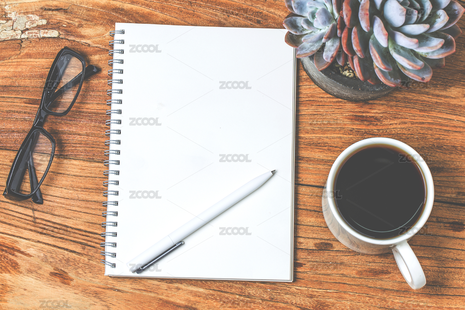 办公桌上空白的笔记本和钢笔,搭配一杯咖啡
