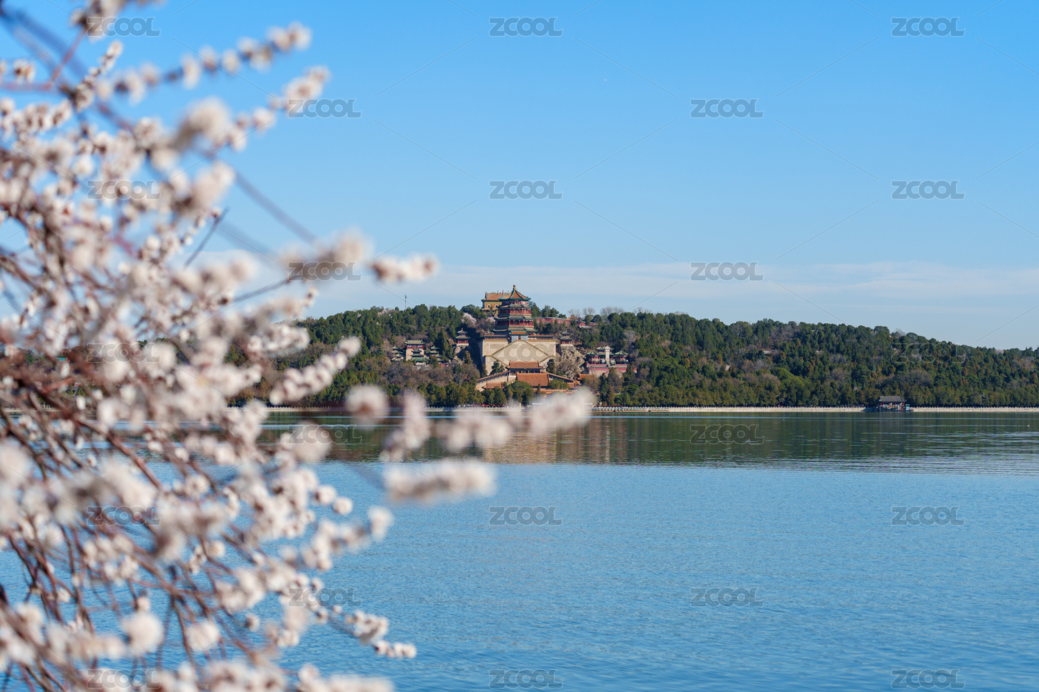 透过盛开的桃花树枝远眺颐和园佛香阁