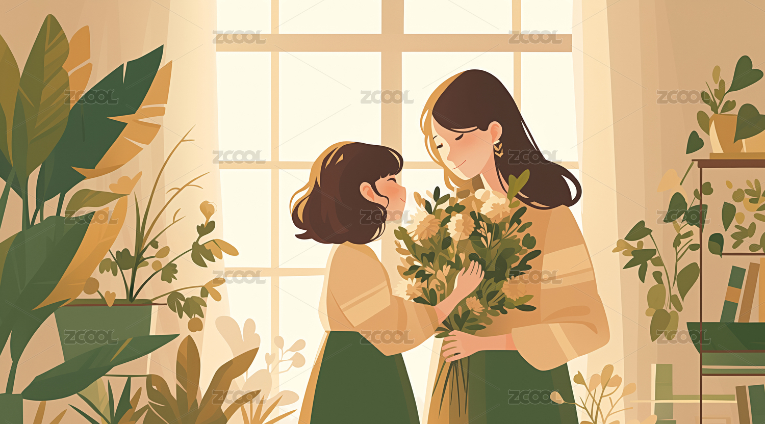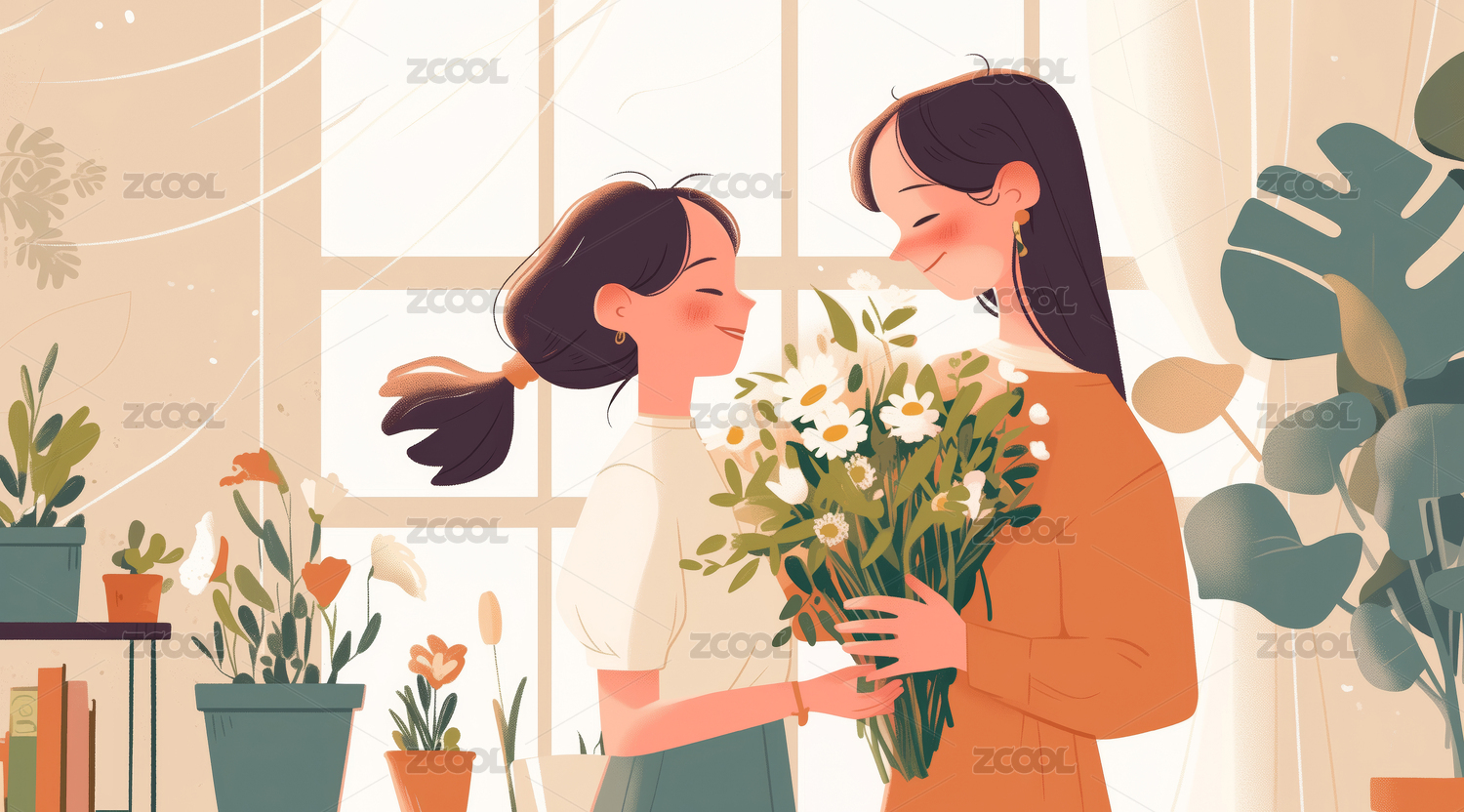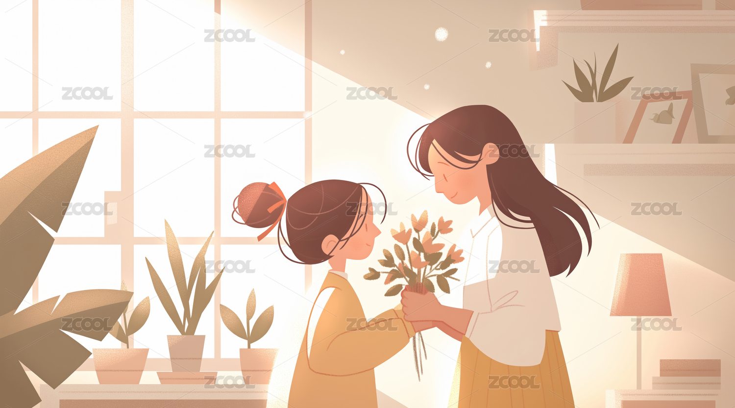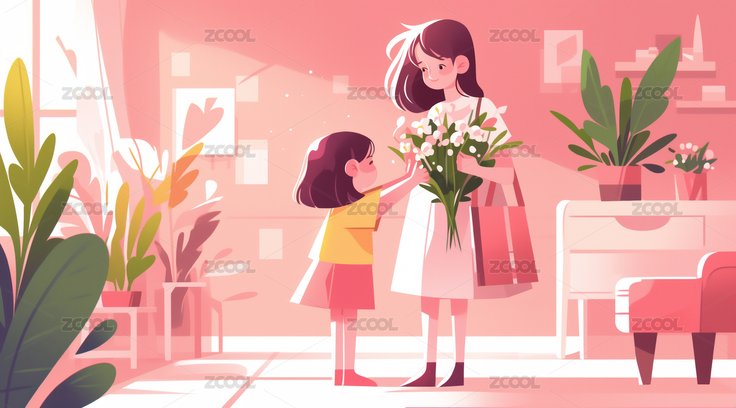 房间内女儿送花给母亲的母亲节插画