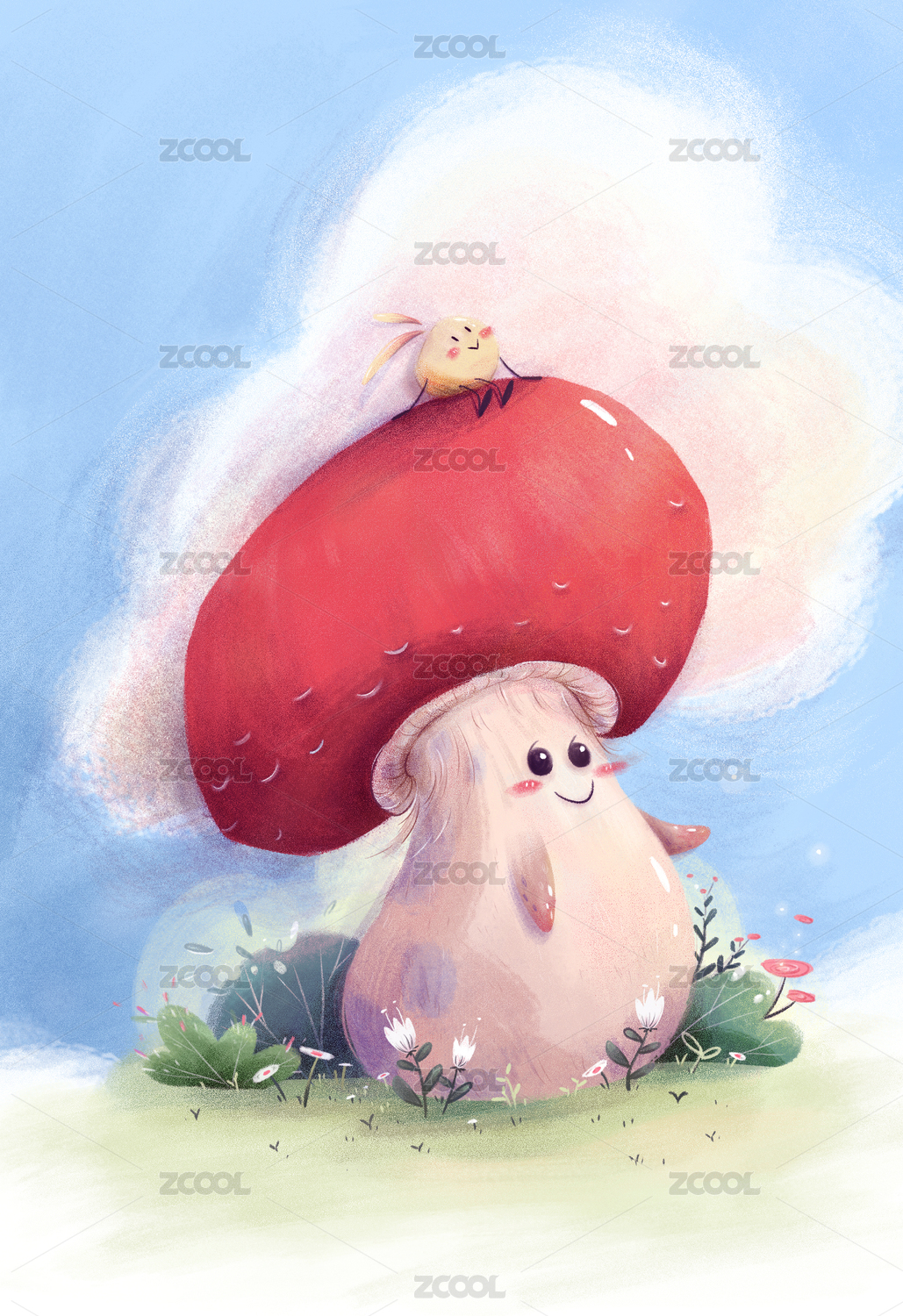 下雨了女孩和鸭子撑着蘑菇伞在森林里走插画