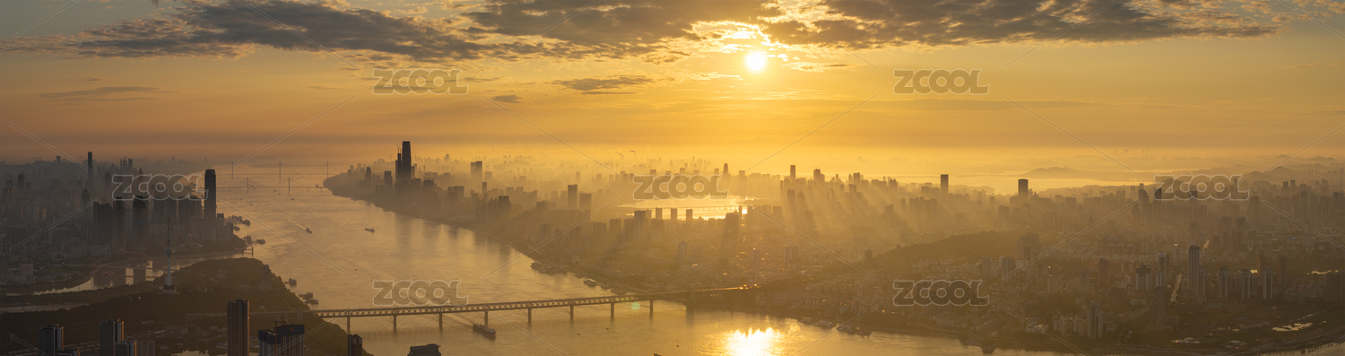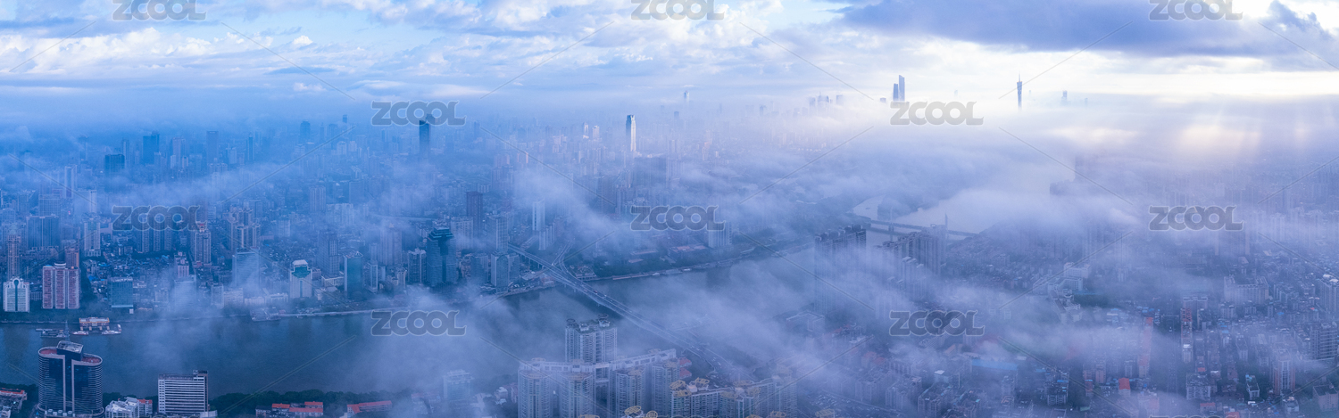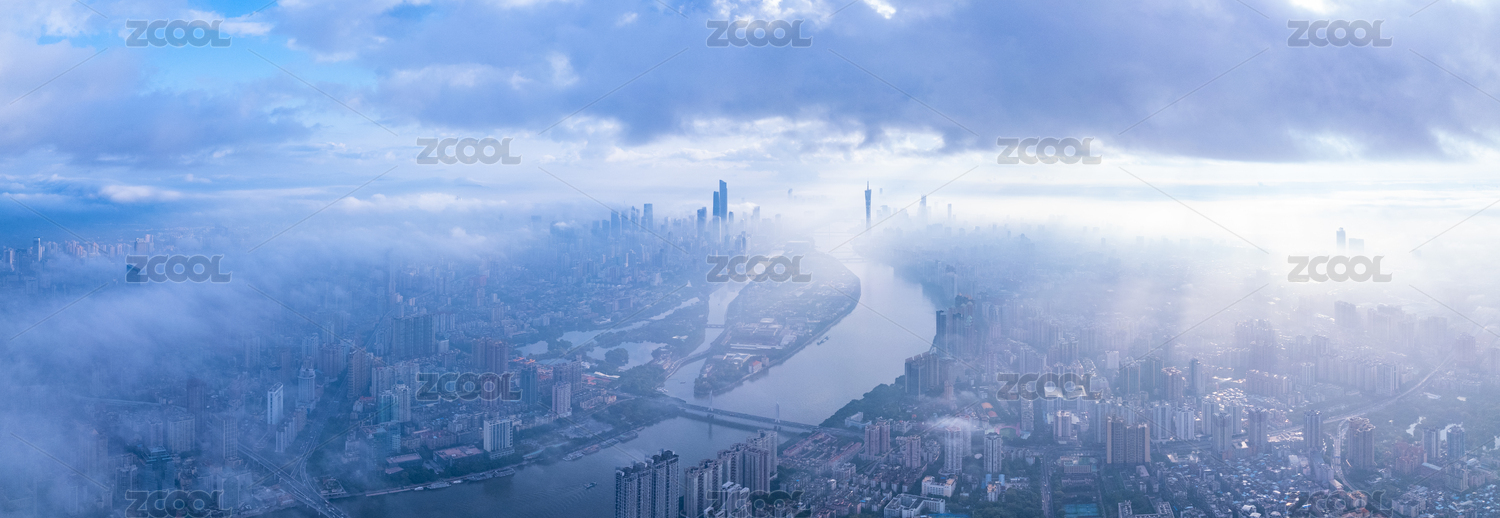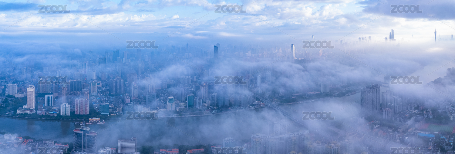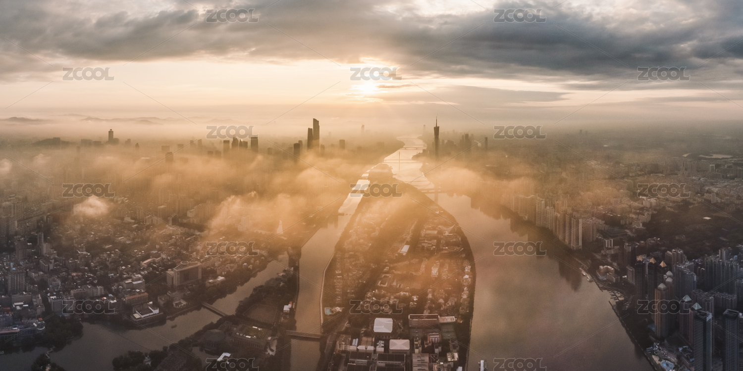 广州珠江岸城市建筑群与日出云雾航拍长图