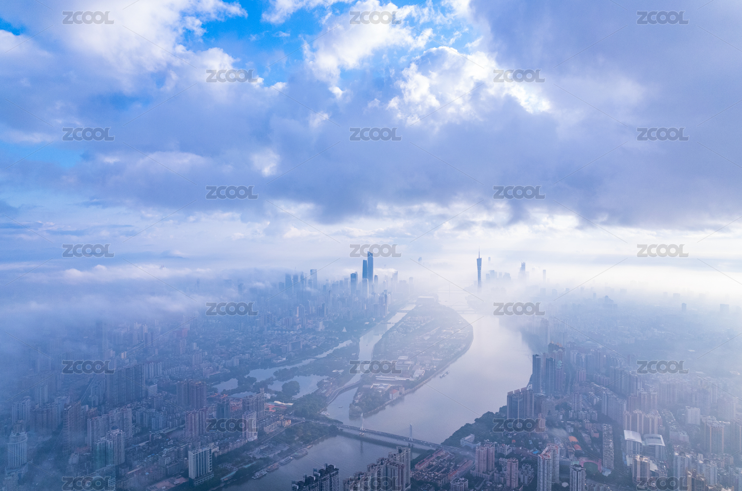 广州珠江岸城市高楼与云雾缭绕风光航拍