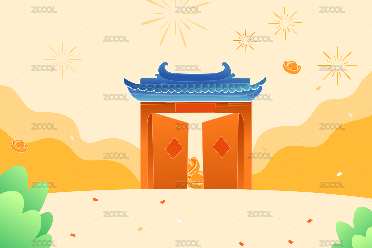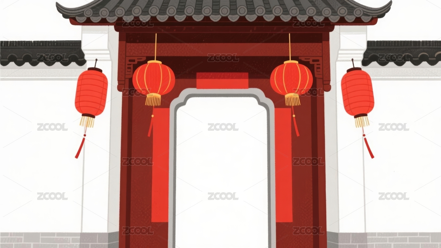 贴春联的中式庭院外景矢量插画
