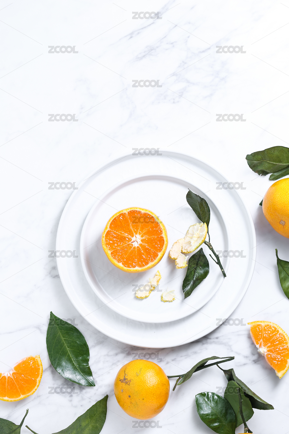 放在大理石背景盘子里切开的新鲜柑橘