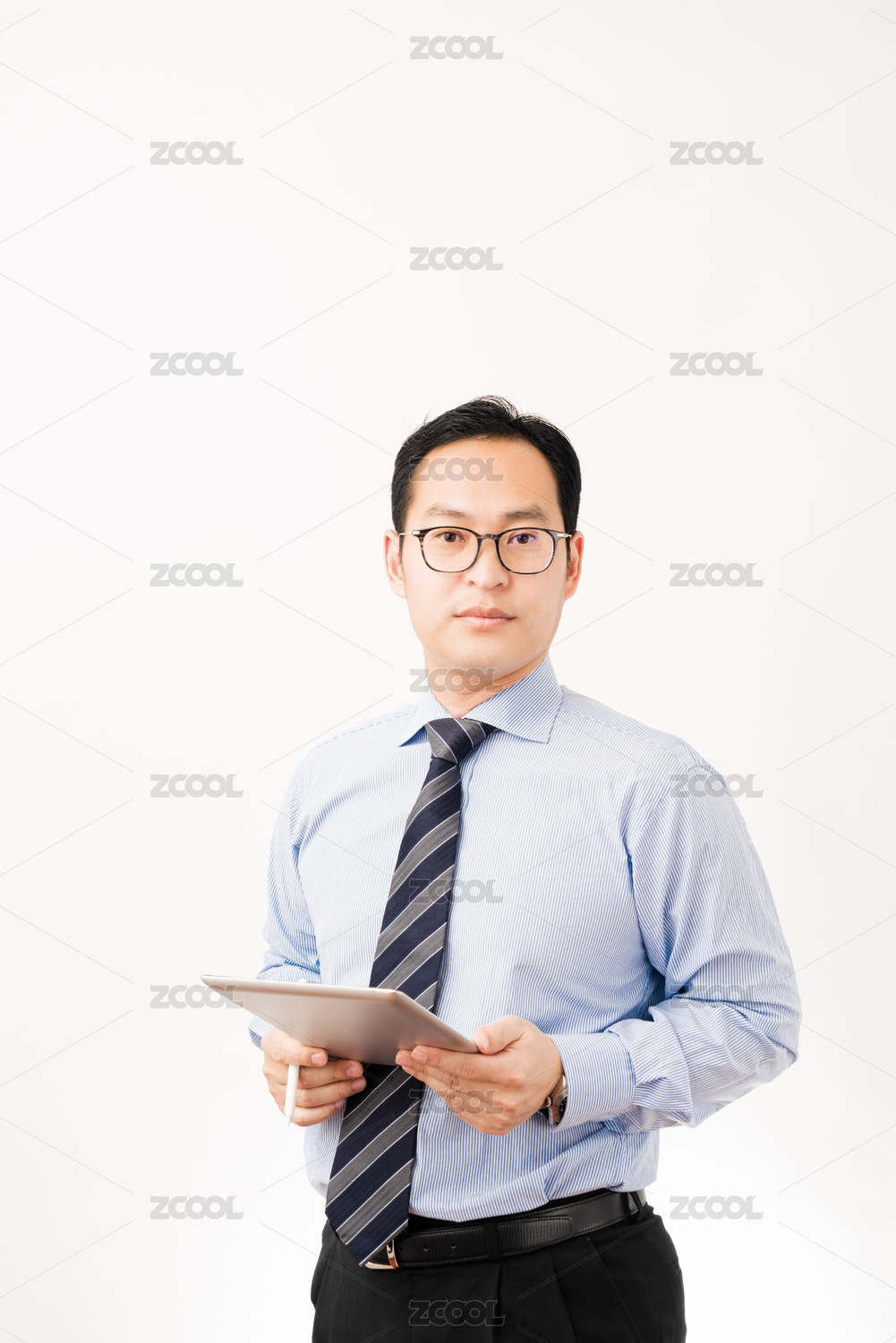 白色背景前穿西服使用平板电脑的亚洲男士