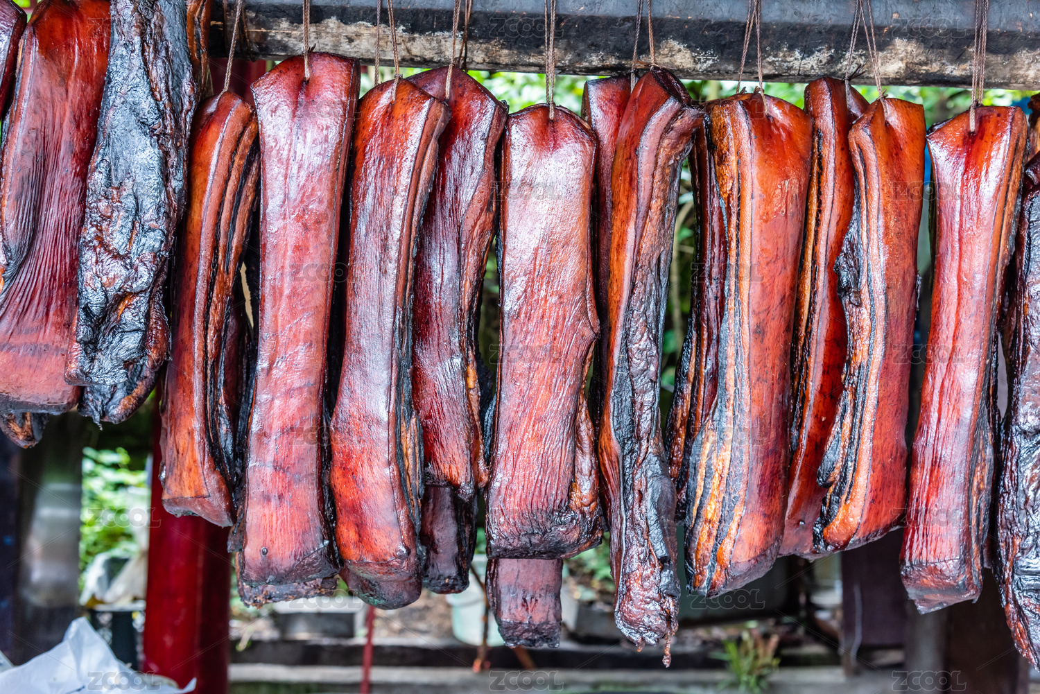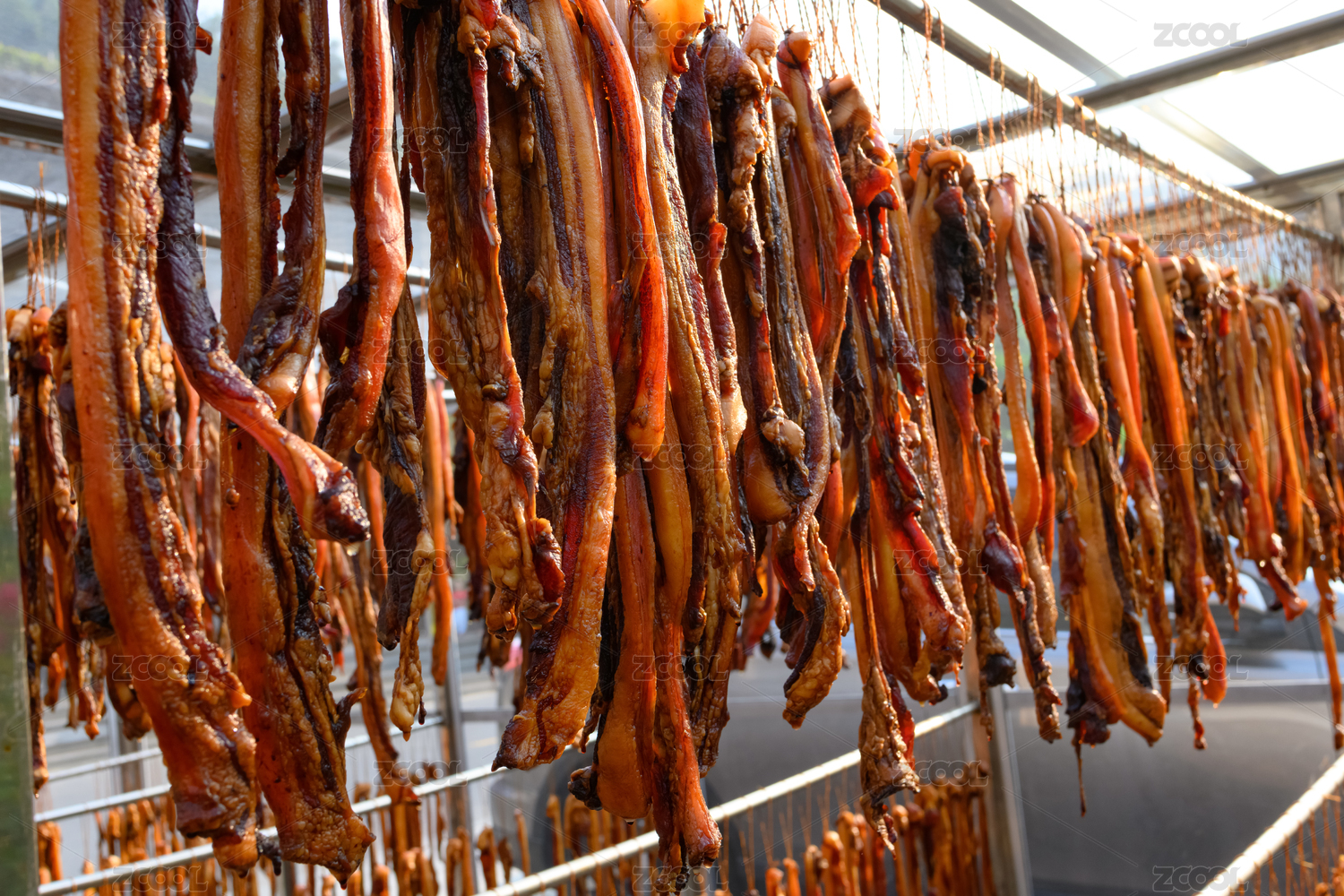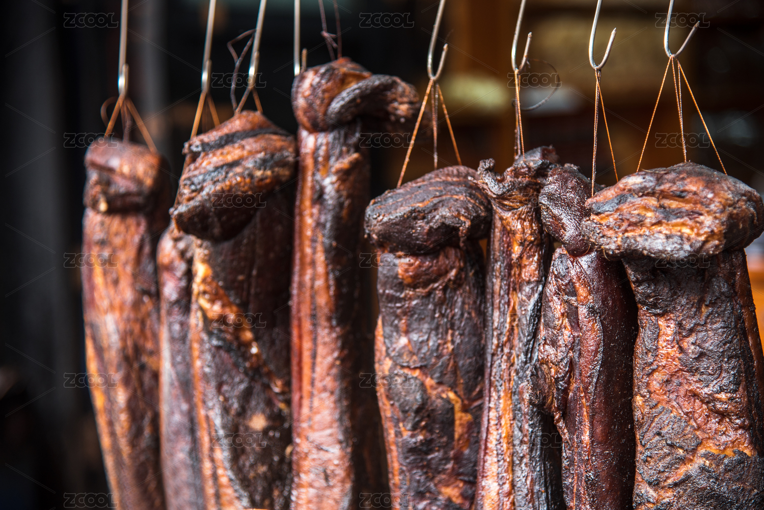 悬挂的川味烟熏老腊肉特写