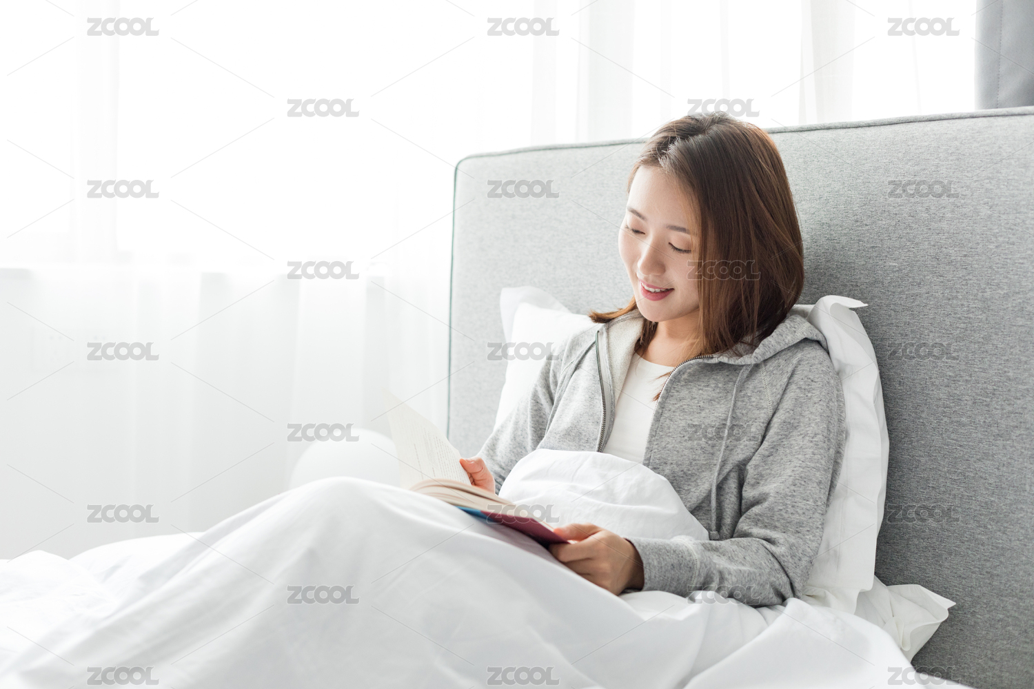 坐在床上靠着枕头低头看书阅读的年轻女性