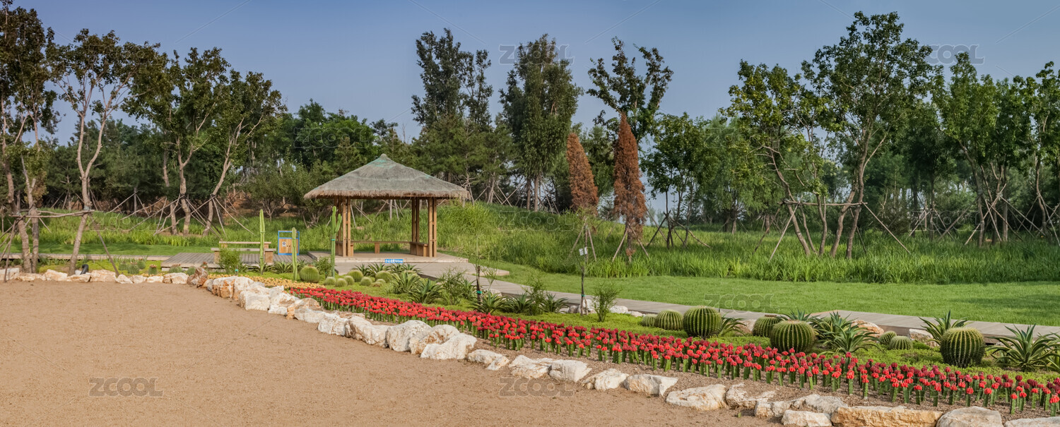 江苏省南京市银杏湖公园茅草遮阳棚建筑景观